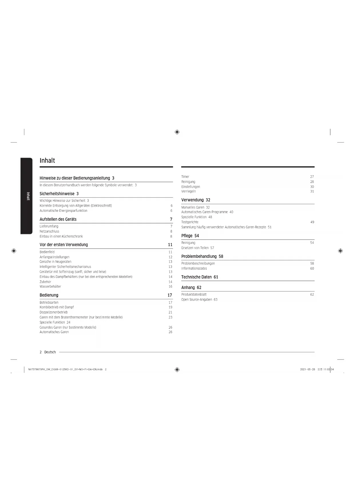 Einbaubackofen Benutzer- und Installationshandbuch NV75T8979** / NV75T8879** NV75T8879RK_SW_DG68-01258D-01_SV+NO+FI+DA+EN.indb 1NV75T8879RK_SW_DG68-01258D-01_SV+NO+FI+DA+EN.indb 1 2021-05-28 오전 11:03:342021-05-28 오전 11:03:342 Deutsch Inhalt Timer 27 Reinigung 28 Einstellungen 30 Verriegeln 31 Verwendung 32 Manuelles Garen 32 Automatisches Garen-Programme 40 Spezielle Funktion 48 Testgerichte 49 Sammlung häug verwendeter Automatisches Garen-Rezepte 51 Pege 54 Reinigung 54 Ersetzen von Teilen 57 Problembehandlung 58 Problembeschreibungen 58 Informationscodes 60 Technische Daten 61 Anhang 62 Produktdatenblatt 62 Open Source-Angaben 63 Inhalt Hinweise zu dieser Bedienungsanleitung 3 In diesem Benutzerhandbuch werden folgende Symbole verwendet: 3 Sicherheitshinweise 3 Wichtige Hinweise zur Sicherheit 3 Korrekte Entsorgung von Altgeräten (Elektroschrott) 6 Automatische Energiesparfunktion 6 Aufstellen des Geräts 7 Lieferumfang 7 Netzanschluss 8 Einbau in einen Küchenschrank 8 Vor der ersten Verwendung 11 Bedienfeld 11 Anfangseinstellungen 12 Gerüche in Neugeräten 13 Intelligenter Sicherheitsmechanismus 13 Gerätetür mit Softeinzug (sanft, sicher und leise) 13 Einbau des Dampfbehälters (nur bei den entsprechenden Modellen) 14 Zubehör 14 Wasserbehälter 16 Bedienung 17 Betriebsarten 17 Kombibetrieb mit Dampf 19 Doppelzonenbetrieb 21 Garen mit dem Bratenthermometer (nur bestimmte Modelle) 23 Spezielle Funktion 24 Gesundes Garen (nur bestimmte Modelle) 26 Automatisches Garen 26 NV75T8879RK_SW_DG68-01258D-01_SV+NO+FI+DA+EN.indb 2NV75T8879RK_SW_DG68-01258D-01_SV+NO+FI+DA+EN.indb 2 2021-05-28 오전 11:03:342021-05-28 오전 11:03:34Deutsch 3 Hinweise zu dieser Bedienungsanleitung Sicherheitshinweise Die Installation dieses Geräts darf nur von einem zugelassenen Elektriker durchgeführt werden. Der Installateur ist dafür verantwortlich, das Gerät an das Stromnetz anzuschließen und dabei die einschlägigen Sicherheitsbestimmungen zu beachten. Wichtige Hinweise zur Sicherheit WARNUNG Dieses Gerät ist nicht zur Verwendung durch Personen (einschließlich Kindern) mit verringerten körperlichen, sensorischen oder mentalen Fähigkeiten oder einem Mangel an Erfahrung und Wissen bestimmt, sofern sie nicht von einer für ihre Sicherheit verantwortlichen Person im Umgang mit dem Gerät unterwiesen wurden und von dieser beaufsichtigt werden. Kinder müssen beaufsichtigt werden, um zu verhindern, dass sie mit dem Gerät spielen. Die Trennungsvorrichtungen sind entsprechend den Anschlussvorschriften in die fest verlegte Leitung einzubauen. Das Gerät muss so aufgestellt werden, dass es auch nach der Installation vom Netz getrennt werden kann. Dies kann erreicht werden, indem der Stecker stets zugänglich bleibt oder in die fest verlegte Leitung ein den Anschlussvorschriften entsprechender Schalter eingebaut wird. Hinweise zu dieser Bedienungsanleitung Vielen Dank, dass Sie sich für einen Einbaubackofen von SAMSUNG entschieden haben. Dieses Handbuch enthält wichtige Informationen zur Sicherheit und Anweisungen, die Ihnen helfen sollen, Ihr Gerät zu bedienen und zu pegen. Bitte nehmen Sie sich vor der Inbetriebnahme Ihres Geräts Zeit, um dieses Handbuch zu lesen und halten Sie es zur späteren Verwendung bereit. In diesem Benutzerhandbuch werden folgende Symbole verwendet: WARNUNG Gefährliche bzw. unsichere Praktiken, die zu schweren Verletzungen, Tod und/oder Sachschäden führen können. VORSICHT Gefährliche bzw. unsichere Praktiken, die zu Verletzungen und/oder Sachschäden führen können. HINWEIS Nützliche Tipps, Empfehlungen oder Informationen, die Ihnen den Umgang mit dem Gerät erleichtern. NV75T8879RK_SW_DG68-01258D-01_SV+NO+FI+DA+EN.indb 3NV75T8879RK_SW_DG68-01258D-01_SV+NO+FI+DA+EN.indb 3 2021-05-28 오전 11:03:342021-05-28 오전 11:03:344 Deutsch Sicherheitshinweise Sicherheitshinweise Benutzen Sie keine scharfen Scheuermittel oder Metallschaber, um den Glaseinsatz der Gerätetür zu reinigen. Sie könnten die Oberäche zerkratzen und damit das Glas zerbrechen lassen. Wenn dieses Gerät über eine Reinigungsfunktion verfügt, müssen Sie überschüssiges Wasser und Kochutensilien vor Verwendung der Dampf- oder Selbstreinigung aus dem Gerät entfernen. Die Reinigungsfunktion ist modellabhängig. Wenn dieses Gerät über eine Reinigungsfunktion verfügt, können die Oberächen während der Reinigung heißer als üblich werden. Kinder müssen deshalb ferngehalten werden. Die Reinigungsfunktion ist modellabhängig. Verwenden Sie ausschließlich das für dieses Gerät empfohlenen Bratenthermometer. (Nur Modelle mit Bratenthermometer) Zur Reinigung des Geräts dürfen keine Dampfreiniger verwendet werden. WARNUNG: Stellen Sie sicher, dass das Gerät vor einem Austausch der Glühlampe vom Stromnetz getrennt wird, da sonst die Gefahr eines Stromschlags besteht. Um eine Überhitzung zu vermeiden, darf die Tür des Geräts nicht mit einer Zierblende versehen werden. Falls das Netzkabel beschädigt ist, muss es vom Hersteller oder vom Kundendienst bzw. von einer entsprechend qualizierten Fachkraft ausgetauscht werden, um Gefährdungen auszuschließen. Bei der angegebenen Befestigungsart dürfen keine Klebemittel eingesetzt werden, da sie keinen ausreichenden Halt bieten. Dieses Gerät darf von Kindern ab 8 Jahren und Personen mit verminderten körperlichen, sensorischen oder geistigen Fähigkeiten oder einem Mangel an Erfahrung und Wissen nur bedient werden, wenn sie unter Aufsicht stehen oder eine Unterweisung zum sicheren Umgang mit dem Gerät erhalten haben und die damit verbundenen Gefahren verstehen. Kinder dürfen nicht mit dem Gerät spielen. Kinder dürfen bei Reinigung und Wartung nur dann helfen, wenn sie dabei beaufsichtigt werden. Halten Sie das Gerät und das Netzkabel außerhalb der Reichweite von Kindern unter 8 Jahren. Das Gerät erhitzt sich im Betrieb. Es ist Vorsicht geboten, damit Sie die Heizelemente im Innern des Geräts nicht berühren. WARNUNG: Zugängliche Te