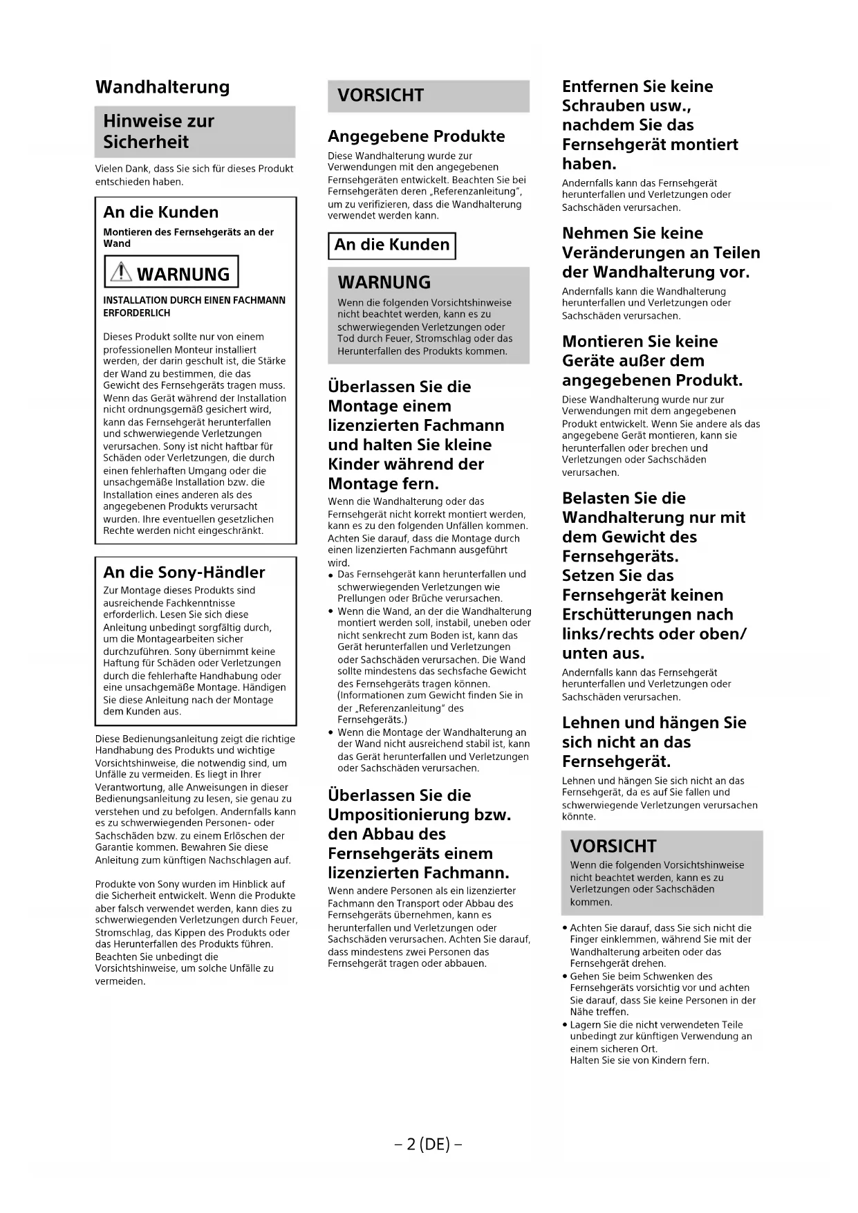 ERFORDERLICH Dieses Produkt sollte nur von einem professionellen Monteur installiert werden, der darin geschult ist, die Stärke der Wand zu bestimmen, die das Gewicht des Fernsehgeräts tragen muss. Wenn das Gerät während der Installation nicht ordnungsgemäß gesichert wird, kann das Fernsehgerät herunterfallen und schwerwiegende Verletzungen verursachen. Sony ist nicht haftbar für Schäden oder Verletzungen, die durch einen fehlerhaften Umgang oder die unsachgemäße Installation bzw. die Installation eines anderen als des angegebenen Produkts verursacht wurden. Ihre eventuellen gesetzlichen Rechte werden nicht eingeschränkt. An die Sony-Händler Zur Montage dieses Produkts sind ausreichende Fachkenntnisse erforderlich. Lesen Sie sich diese Anleitung unbedingt sorgfältig durch, um die Montagearbeiten sicher durchzuführen. Sony übernimmt keine Haftung für Schäden oder Verletzungen durch die fehlerhafte Handhabung oder eine unsachgemäße Montage. Händigen Sie diese Anleitung nach der Montage dem Kunden aus. Diese Bedienungsanleitung zeigt die richtige Handhabung des Produkts und wichtige Vorsichtshinweise, die notwendig sind, um Unfälle zu vermeiden. Es liegt in Ihrer Verantwortung, alle Anweisungen in dieser Bedienungsanleitung zu lesen, sie genau zu verstehen und zu befolgen. Andernfalls kann es zu schwerwiegenden Personen- oder Sachschäden bzw. zu einem Erlöschen der Garantie kommen. Bewahren Sie diese Anleitung zum künftigen Nachschlagen auf. Produkte von Sony wurden im Hinblick auf die Sicherheit entwickelt. Wenn die Produkte aber falsch verwendet werden, kann dies zu schwerwiegenden Verletzungen durch Feuer, Stromschlag, das Kippen des Produkts oder das Herunterfallen des Produkts führen. Beachten Sie unbedingt die Vorsichtshinweise, um solche Unfälle zu vermeiden. VORSICHT Angegebene Produkte Diese Wandhalterung wurde zur Verwendungen mit den angegebenen Fernsehgeräten entwickelt. Beachten Sie bei Fernsehgeräten deren „Referenzanleitung“, um zu verifizieren, dass die Wandhalterung verwendet werden kann. An die Kunden WARNUNG Wenn die folgenden Vorsichtshinweise nicht beachtet werden, kann es zu schwerwiegenden Verletzungen oder Tod durch Feuer, Stromschlag oder das Herunterfallen des Produkts kommen. Überlassen Sie die Montage einem lizenzierten Fachmann und halten Sie kleine Kinder während der Montage fern. Wenn die Wandhalterung oder das Fernsehgerät nicht korrekt montiert werden, kann es zu den folgenden Unfällen kommen. Achten Sie darauf, dass die Montage durch einen lizenzierten Fachmann ausgeführt wird.
