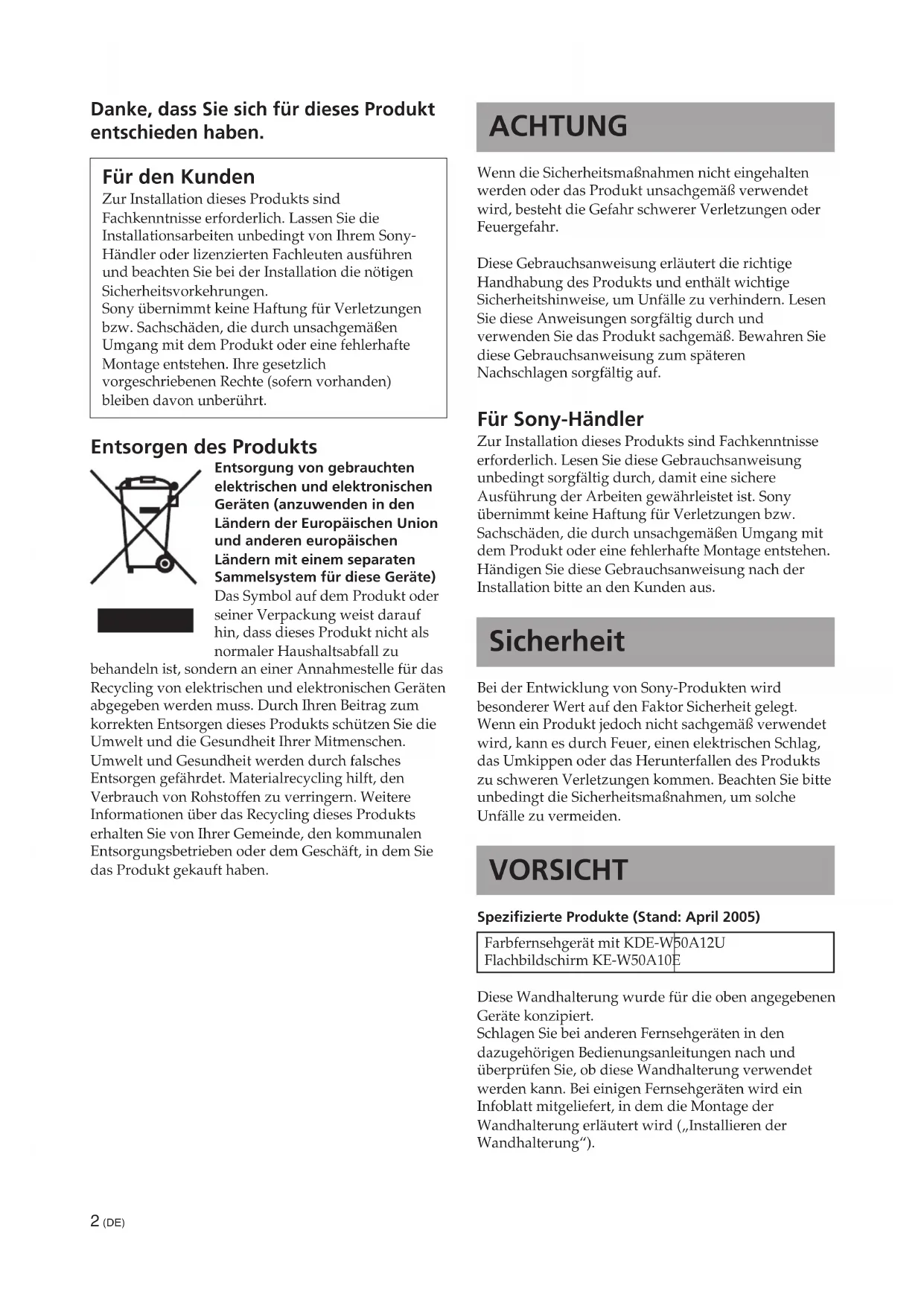 (17/32) 393 ± 0.5 (15 15/32 ± 5/256) 131 (5 5/32) 131 (5 5/32)2 (DE) ACHTUNG Wenn die Sicherheitsmaßnahmen nicht eingehalten werden oder das Produkt unsachgemäß verwendet wird, besteht die Gefahr schwerer Verletzungen oder Feuergefahr. Diese Gebrauchsanweisung erläutert die richtige Handhabung des Produkts und enthält wichtige Sicherheitshinweise, um Unfälle zu verhindern. Lesen Sie diese Anweisungen sorgfältig durch und verwenden Sie das Produkt sachgemäß. Bewahren Sie diese Gebrauchsanweisung zum späteren Nachschlagen sorgfältig auf. Für Sony-Händler Zur Installation dieses Produkts sind Fachkenntnisse erforderlich. Lesen Sie diese Gebrauchsanweisung unbedingt sorgfältig durch, damit eine sichere Ausführung der Arbeiten gewährleistet ist. Sony übernimmt keine Haftung für Verletzungen bzw. Sachschäden, die durch unsachgemäßen Umgang mit dem Produkt oder eine fehlerhafte Montage entstehen. Händigen Sie diese Gebrauchsanweisung nach der Installation bitte an den Kunden aus. Sicherheit Bei der Entwicklung von Sony-Produkten wird besonderer Wert auf den Faktor Sicherheit gelegt. Wenn ein Produkt jedoch nicht sachgemäß verwendet wird, kann es durch Feuer, einen elektrischen Schlag, das Umkippen oder das Herunterfallen des Produkts zu schweren Verletzungen kommen. Beachten Sie bitte unbedingt die Sicherheitsmaßnahmen, um solche Unfälle zu vermeiden. VORSICHT Spezifizierte Produkte (Stand: April 2005) Farbfernsehgerät mit KDE-W50A12U Flachbildschirm KE-W50A10E Diese Wandhalterung wurde für die oben angegebenen Geräte konzipiert. Schlagen Sie bei anderen Fernsehgeräten in den dazugehörigen Bedienungsanleitungen nach und überprüfen Sie, ob diese Wandhalterung verwendet werden kann. Bei einigen Fernsehgeräten wird ein Infoblatt mitgeliefert, in dem die Montage der Wandhalterung erläutert wird („Installieren der Wandhalterung“). Danke, dass Sie sich für dieses Produkt entschieden haben. Für den Kunden Zur Installation dieses Produkts sind Fachkenntnisse erforderlich. Lassen Sie die Installationsarbeiten unbedingt von Ihrem Sony- Händler oder lizenzierten Fachleuten ausführen und beachten Sie bei der Installation die nötigen Sicherheitsvorkehrungen. Sony übernimmt keine Haftung für Verletzungen bzw. Sachschäden, die durch unsachgemäßen Umgang mit dem Produkt oder eine fehlerhafte Montage entstehen. Ihre gesetzlich vorgeschriebenen Rechte (sofern vorhanden) bleiben davon unberührt. Entsorgen des Produkts Entsorgung von gebrauchten elektrischen und elektronischen Geräten (anzuwenden in den Ländern der Europäischen Union und anderen europäischen Ländern mit einem separaten Sammelsystem für diese Geräte) Das Symbol auf dem Produkt oder seiner Verpackung weist darauf hin, dass dieses Produkt nicht als normaler Haushaltsabfall zu behandeln ist, sondern an einer Annahmestelle für das Recycling von elektrischen und elektronischen Geräten abgegeben werden muss. Durch Ihren Beitrag zum korrekten Entsorgen dieses Produkts schützen Sie die Umwelt und die Gesundheit Ihrer Mitmenschen. Umwelt und Gesundheit werden durch falsches Entsorgen gefährdet. Materialrecycling hilft, den Verbrauch von Rohstoffen zu verringern. Weitere Informationen über das Recycling dieses Produkts erhalten Sie von Ihrer Gemeinde, den kommunalen Entsorgungsbetrieben oder dem Geschäft, in dem Sie das Produkt gekauft haben.3 (DE) Deutsch