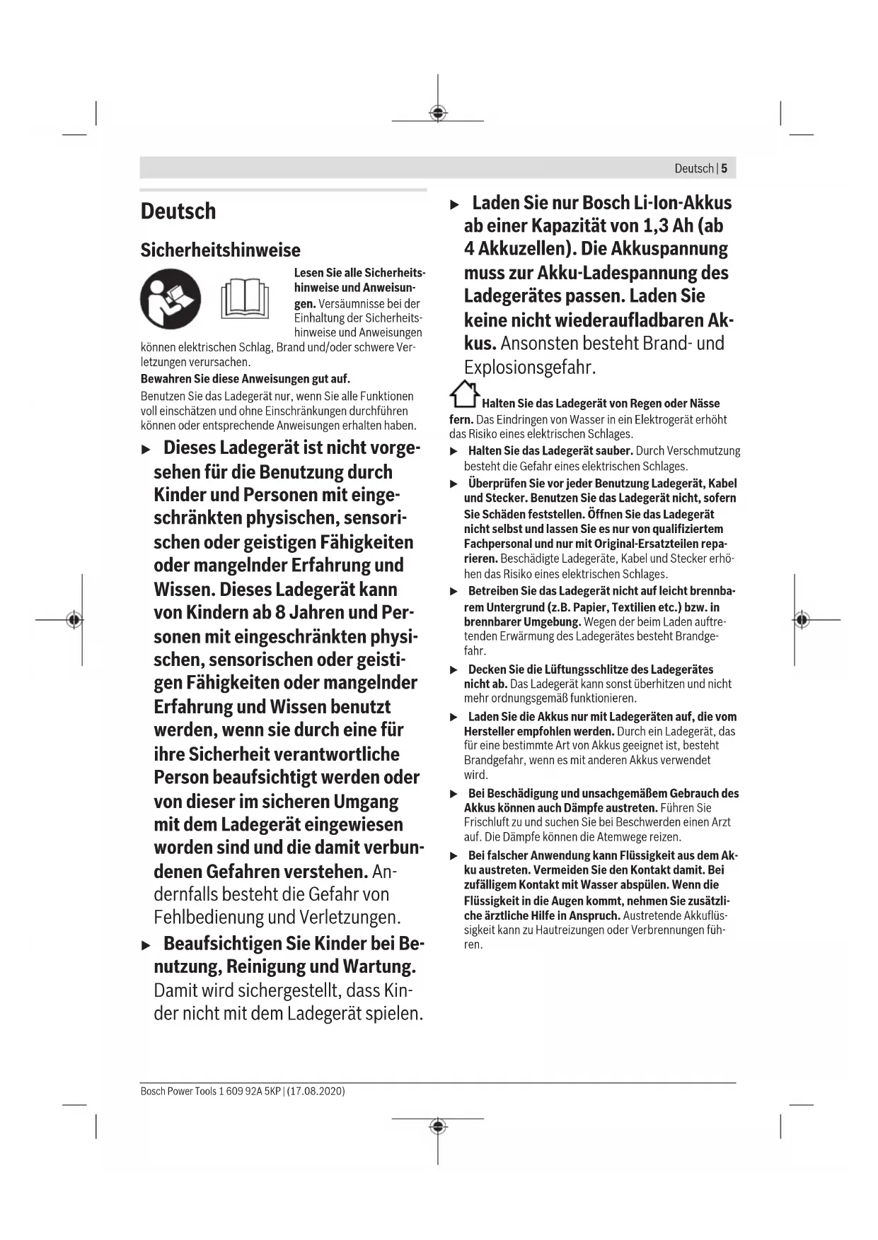 1 609 92A 5KP | (17.08.2020) Bosch Power ToolsDeutsch | 5 Deutsch Sicherheitshinweise Lesen Sie alle Sicherheits- hinweise und Anweisun- gen. Versäumnisse bei der Einhaltung der Sicherheits- hinweise und Anweisungen können elektrischen Schlag, Brand und/oder schwere Ver- letzungen verursachen. Bewahren Sie diese Anweisungen gut auf. Benutzen Sie das Ladegerät nur, wenn Sie alle Funktionen voll einschätzen und ohne Einschränkungen durchführen können oder entsprechende Anweisungen erhalten haben. u Dieses Ladegerät ist nicht vorge- sehen für die Benutzung durch Kinder und Personen mit einge- schränkten physischen, sensori- schen oder geistigen Fähigkeiten oder mangelnder Erfahrung und Wissen. Dieses Ladegerät kann von Kindern ab 8 Jahren und Per- sonen mit eingeschränkten physi- schen, sensorischen oder geisti- gen Fähigkeiten oder mangelnder Erfahrung und Wissen benutzt werden, wenn sie durch eine für ihre Sicherheit verantwortliche Person beaufsichtigt werden oder von dieser im sicheren Umgang mit dem Ladegerät eingewiesen worden sind und die damit verbun- denen Gefahren verstehen. An- dernfalls besteht die Gefahr von Fehlbedienung und Verletzungen. u Beaufsichtigen Sie Kinder bei Be- nutzung, Reinigung und Wartung. Damit wird sichergestellt, dass Kin- der nicht mit dem Ladegerät spielen. u Laden Sie nur Bosch Li-Ion-Akkus ab einer Kapazität von 1,3 Ah (ab 4 Akkuzellen). Die Akkuspannung muss zur Akku-Ladespannung des Ladegerätes passen. Laden Sie keine nicht wiederaufladbaren Ak- kus. Ansonsten besteht Brand- und Explosionsgefahr. Halten Sie das Ladegerät von Regen oder Nässe fern. Das Eindringen von Wasser in ein Elektrogerät erhöht das Risiko eines elektrischen Schlages. u Halten Sie das Ladegerät sauber. Durch Verschmutzung besteht die Gefahr eines elektrischen Schlages. u Überprüfen Sie vor jeder Benutzung Ladegerät, Kabel und Stecker. Benutzen Sie das Ladegerät nicht, sofern Sie Schäden feststellen. Öffnen Sie das Ladegerät nicht selbst und lassen Sie es nur von qualifiziertem Fachpersonal und nur mit Original-Ersatzteilen repa- rieren. Beschädigte Ladegeräte, Kabel und Stecker erhö- hen das Risiko eines elektrischen Schlages. u Betreiben Sie das Ladegerät nicht auf leicht brennba- rem Untergrund (z.B. Papier, Textilien etc.) bzw. in brennbarer Umgebung. Wegen der beim Laden auftre- tenden Erwärmung des Ladegerätes besteht Brandge- fahr. u Decken Sie die Lüftungsschlitze des Ladegerätes nicht ab. Das Ladegerät kann sonst überhitzen und nicht mehr ordnungsgemäß funktionieren. u Laden Sie die Akkus nur mit Ladegeräten auf, die vom Hersteller empfohlen werden. Durch ein Ladegerät, das fur eine bestimmte Art von Akkus geeignet ist, besteht Brandgefahr, wenn es mit anderen Akkus verwendet wird. u Bei Beschädigung und unsachgemäßem Gebrauch des Akkus können auch Dämpfe austreten. Führen Sie Frischluft zu und suchen Sie bei Beschwerden einen Arzt auf. Die Dämpfe können die Atemwege reizen. u Bei falscher Anwendung kann Flüssigkeit aus dem Ak- ku austreten. Vermeiden Sie den Kontakt damit. Bei zufälligem Kontakt mit Wasser abspülen. Wenn die Flüssigkeit in die Augen kommt, nehmen Sie zusätzli- che ärztliche Hilfe in Anspruch. Austretende Akkuflüs- sigkeit kann zu Hautreizungen oder Verbrennungen füh- ren. Bosch Power Tools 1 609 92A 5KP | (17.08.2020)6 | Deutsch Produkt- und Leistungsbeschreibung Bestimmungsgemäßer Gebrauch Das Ladegerät ist bestimmt zum Laden von wiederaufladba- ren Bosch Li-Ion-Akkus. Abgebildete Komponenten Die Nummerierung der abgebildeten Komponenten bezieht sich auf die Darstellung des Ladegerätes auf der Grafikseite. (1) Akku