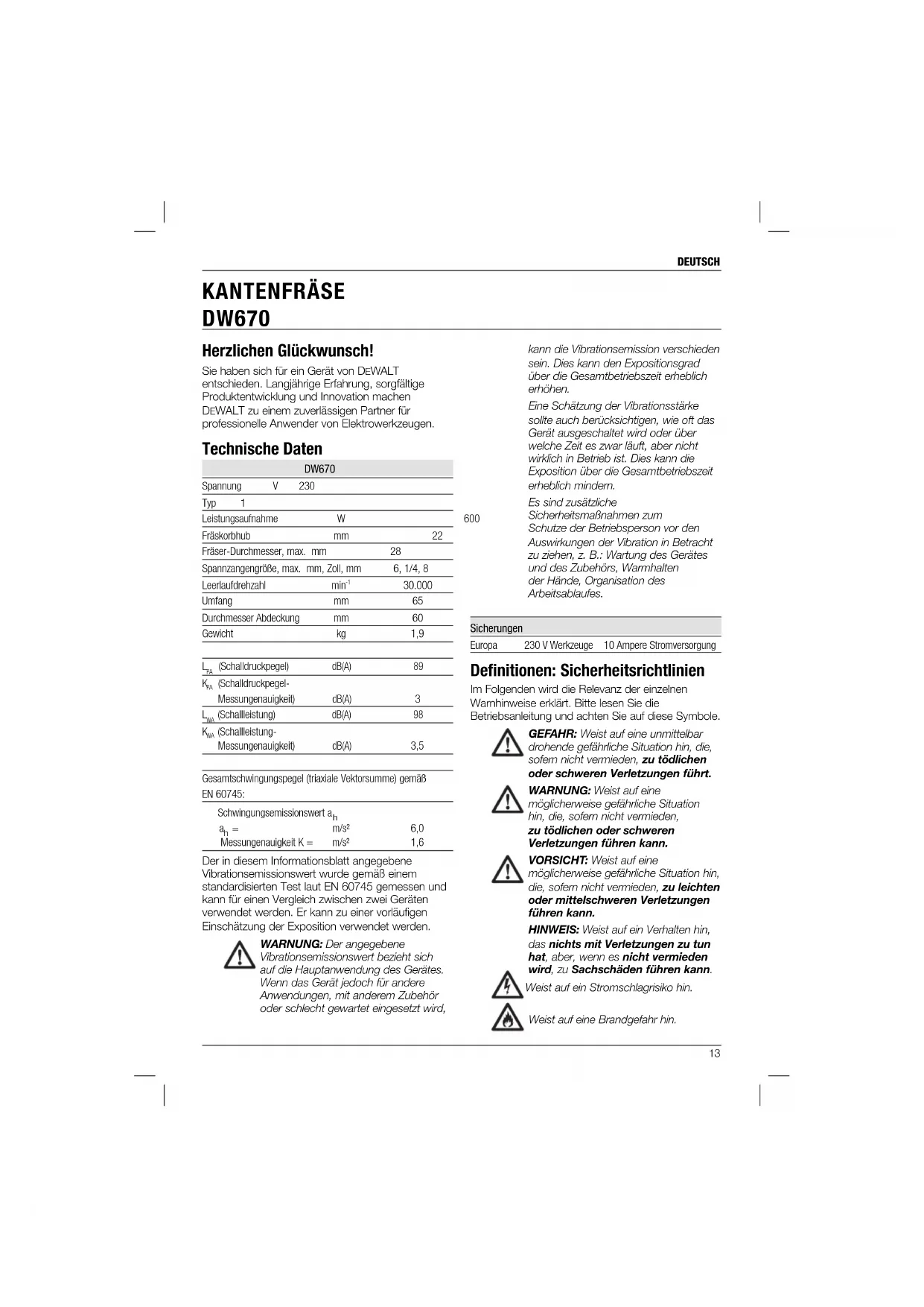 KANTENFRÄSE DW670 Herzlichen Glückwunsch! Sie haben sich für ein Gerät von DEWALT entschieden. Langjährige Erfahrung, sorgfältige Produktentwicklung und Innovation machen DEWALT zu einem zuverlässigen Partner für professionelle Anwender von Elektrowerkzeugen. Technische Daten DW670 Spannung V 230 Typ 1 Leistungsaufnahme W 600 Fräskorbhub mm 22 Fräser-Durchmesser, max. mm 28 Spannzangengröße, max. mm, Zoll, mm 6, 1/4, 8 Leerlaufdrehzahl min