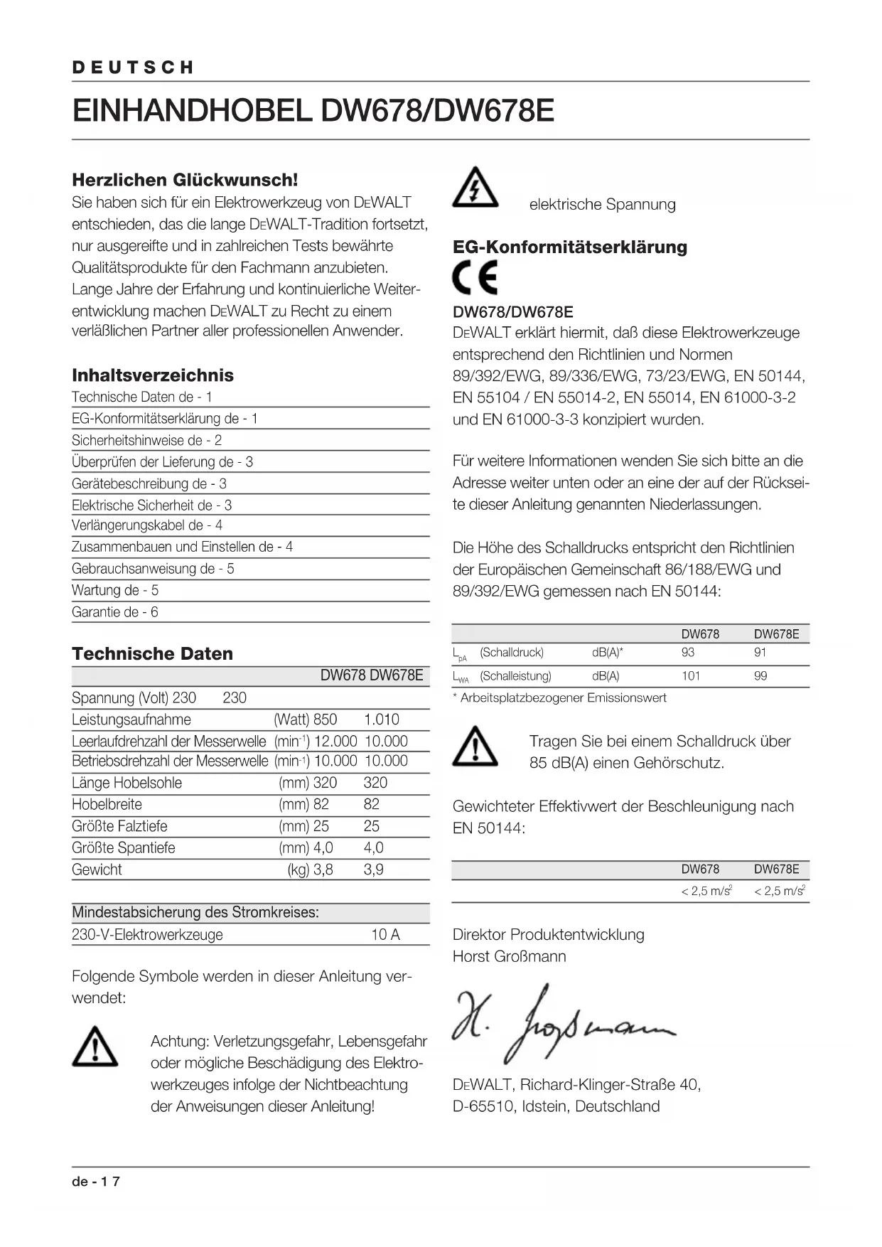 ) 10.000 10.000 Länge Hobelsohle (mm) 320 320 Hobelbreite (mm) 82 82 Größte Falztiefe (mm) 25 25 Größte Spantiefe (mm) 4,0 4,0 Gewicht (kg) 3,8 3,9 Mindestabsicherung des Stromkreises: 230-V-Elektrowerkzeuge 10 A Folgende Symbole werden in dieser Anleitung ver- wendet: Achtung: Verletzungsgefahr, Lebensgefahr oder mögliche Beschädigung des Elektro- werkzeuges infolge der Nichtbeachtung der Anweisungen dieser Anleitung! elektrische Spannung EG-Konformitätserklärung DW678/DW678E DEWALT erklärt hiermit, daß diese Elektrowerkzeuge entsprechend den Richtlinien und Normen 89/392/EWG, 89/336/EWG, 73/23/EWG, EN 50144, EN 55104 / EN 55014-2, EN 55014, EN 61000-3-2 und EN 61000-3-3 konzipiert wurden. Für weitere Informationen wenden Sie sich bitte an die Adresse weiter unten oder an eine der auf der Rücksei- te dieser Anleitung genannten Niederlassungen. Die Höhe des Schalldrucks entspricht den Richtlinien der Europäischen Gemeinschaft 86/188/EWG und 89/392/EWG gemessen nach EN 50144: DW678 DW678E