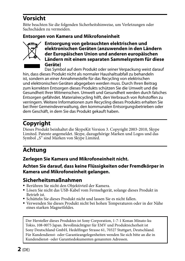 Berühren Sie nicht den Objektivteil der Kamera. Lösen Sie nicht das USB-Kabel vom Fernsehgerät, solange dieses Produkt in Betrieb ist. Schütteln Sie dieses Produkt nicht und lassen Sie es nicht fallen. Verwenden Sie dieses Produkt nicht bei hohen Temperaturen oder in der Nähe eines starken Magnetfeldes. Der Hersteller dieses Produktes ist Sony Corporation, 1-7-1 Konan Minato-ku Tokio, 108-0075 Japan. Bevollmächtigter für EMV und Produktsicherheit ist Sony Deutschland GmbH, Hedelfinger Strasse 61, 70327 Stuttgart, Deutschland. Für Kundendienst- oder Garantieangelegenheiten wenden Sie sich bitte an die in Kundendienst- oder Garantiedokumenten genannten Adressen. (DE)