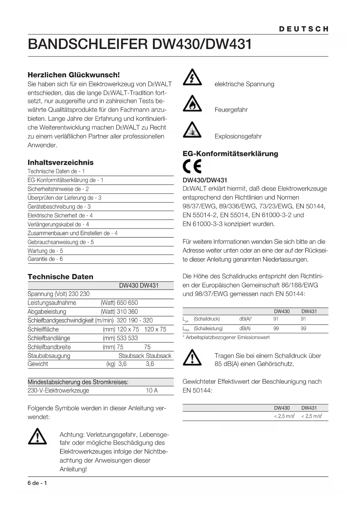 Herzlichen Glückwunsch! Sie haben sich für ein Elektrowerkzeug von DEWALT entschieden, das die lange DEWALT-Tradition fort- setzt, nur ausgereifte und in zahlreichen Tests be- währte Qualitätsprodukte für den Fachmann anzu- bieten. Lange Jahre der Erfahrung und kontinuierli- che Weiterentwicklung machen DEWALT zu Recht zu einem verläßlichen Partner aller professionellen Anwender. Inhaltsverzeichnis Technische Daten de - 1 EG-Konformitätserklärung de - 1 Sicherheitshinweise de - 2 Überprüfen der Lieferung de - 3 Gerätebeschreibung de - 3 Elektrische Sicherheit de - 4 Verlängerungskabel de - 4 Zusammenbauen und Einstellen de - 4 Gebrauchsanweisung de - 5 Wartung de - 5 Garantie de - 6 Technische Daten DW430 DW431 Spannung (Volt) 230 230 Leistungsaufnahme (Watt) 650 650 Abgabeleistung (Watt) 310 360 Schleifbandgeschwindigkeit (m/min) 320 190 - 320 Schleiffläche (mm) 120 x 75 120 x 75 Schleifbandlänge (mm) 533 533 Schleifbandbreite (mm) 75 75 Staubabsaugung Staubsack Staubsack Gewicht (kg) 3,6 3,6 Mindestabsicherung des Stromkreises: 230-V-Elektrowerkzeuge 10 A Folgende Symbole werden in dieser Anleitung ver- wendet: Achtung: Verletzungsgefahr, Lebensge- fahr oder mögliche Beschädigung des Elektrowerkzeuges infolge der Nichtbe- achtung der Anweisungen dieser Anleitung! elektrische Spannung Feuergefahr Explosionsgefahr EG-Konformitätserklärung DW430/DW431 DEWALT erklärt hiermit, daß diese Elektrowerkzeuge entsprechend den Richtlinien und Normen 98/37/EWG, 89/336/EWG, 73/23/EWG, EN 50144, EN 55014-2, EN 55014, EN 61000-3-2 und EN 61000-3-3 konzipiert wurden. Für weitere Informationen wenden Sie sich bitte an die Adresse weiter unten oder an eine der auf der Rücksei- te dieser Anleitung genannten Niederlassungen. Die Höhe des Schalldrucks entspricht den Richtlini- en der Europäischen Gemeinschaft 86/188/EWG und 98/37/EWG gemessen nach EN 50144: DW430 DW431