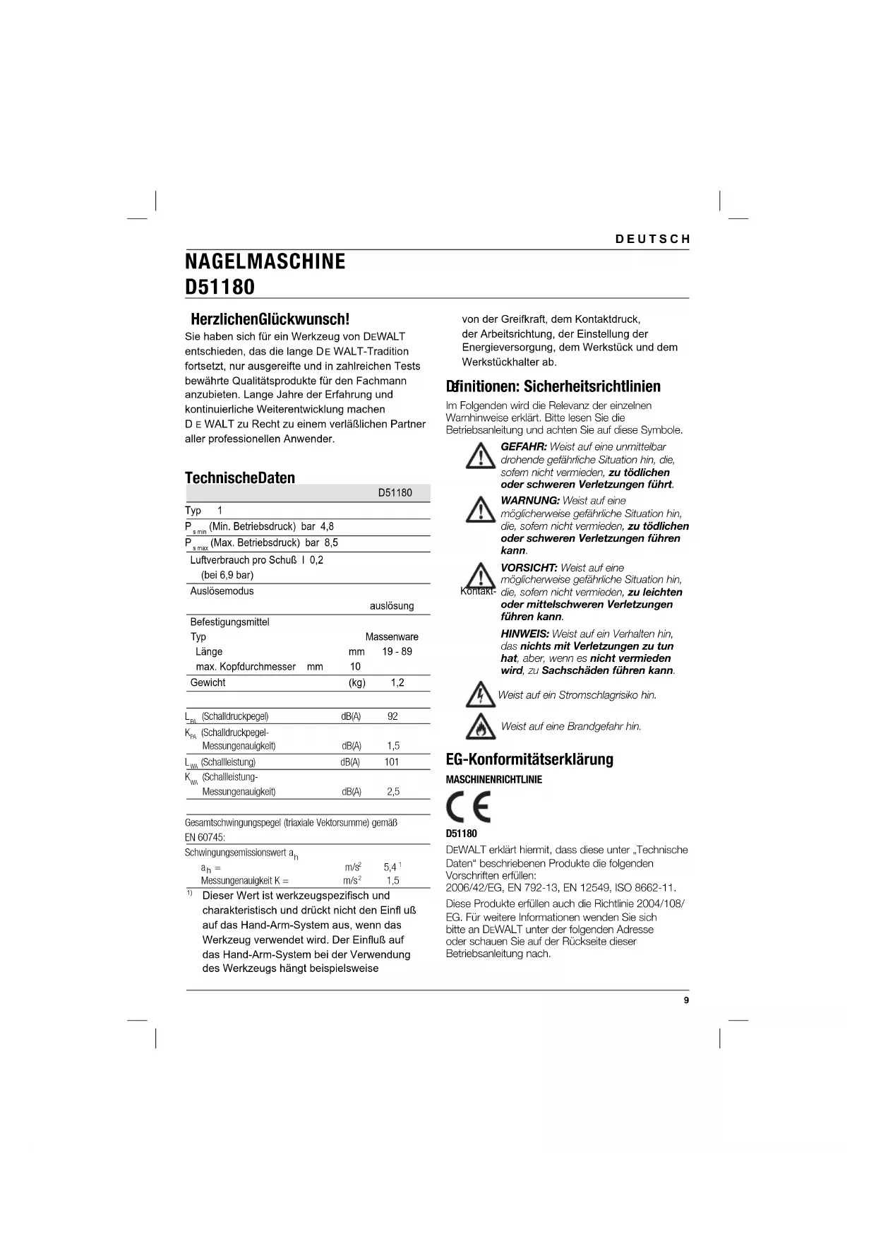 - Produktet returneres komplet med alle originale komponenter. Hvis du ønsker at reklamere, kontakt din forhandler eller find adressen på dit nærmeste autoriserede DEWALT serviceværksted i DEWALT kataloget eller kontakt dit D EWALT kontor på den adresse, der er opgivet i denne manual. Der findes en liste over autoriserede DEWALT serviceværksteder og detaljerede oplysninger om vores eftersalgsservice på følgende internetadresse: www.2helpU. com.9 DEUTSCH NAGELMASCHINE D51180 Herzlichen Glückwunsch! Sie haben sich für ein Werkzeug von D E WALT entschieden, das die lange D E WALT-Tradition fortsetzt, nur ausgereifte und in zahlreichen Tests bewährte Qualitätsprodukte für den Fachmann anzubieten. Lange Jahre der Erfahrung und kontinuierliche Weiterentwicklung machen D E WALT zu Recht zu einem verläßlichen Partner aller professionellen Anwender. Technische Daten D51180 Typ 1