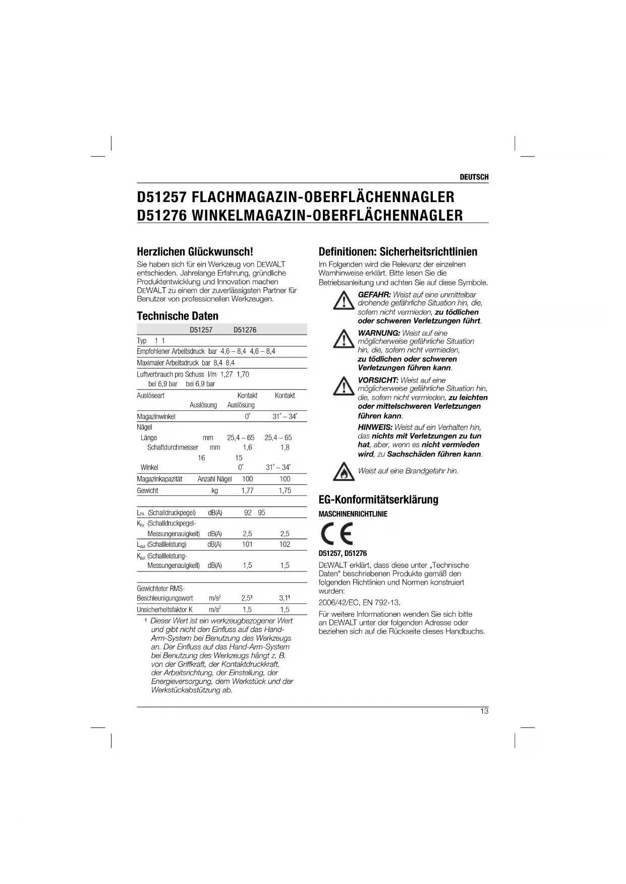 Dieser Wert ist ein werkzeugbezogener Wert und gibt nicht den Einfluss auf das Hand- Arm-System bei Benutzung des Werkzeugs an. Der Einfluss auf das Hand-Arm-System bei Benutzung des Werkzeugs hângt z. B. von der Griffkraft, der Kontaktdruckkraft, der Arbeitsrichtung, der Einstellung, der Energieversorgung, dem Werkstück und der Werkstückabstützung ab. Defi nitionen: Sicherheitsrichtlinien Im Folgenden wird die Relevanz der einzelnen Warnhinweise erklärt. Bitte lesen Sie die Betriebsanleitung und achten Sie auf diese Symbole. GEFAHR: Weist auf eine unmittelbar drohende gefährliche Situation hin, die, sofern nicht vermieden, zu tödlichen oder schweren Verletzungen führt. WARNUNG: Weist auf eine möglicherweise gefährliche Situation hin, die, sofern nicht vermieden, zu tödlichen oder schweren Verletzungen führen kann. VORSICHT: Weist auf eine möglicherweise gefährliche Situation hin, die, sofern nicht vermieden, zu leichten oder mittelschweren Verletzungen führen kann. HINWEIS: Weist auf ein Verhalten hin, das nichts mit Verletzungen zu tun hat, aber, wenn es nicht vermieden wird, zu Sachschäden führen kann. Weist auf eine Brandgefahr hin. EG-Konformitätserklärung MASCHINENRICHTLINIE D51257, D51276 DEWALT erklärt, dass diese unter „Technische Daten“ beschriebenen Produkte gemäß den folgenden Richtlinien und Normen konstruiert wurden: 2006/42/EC, EN 792-13. Für weitere Informationen wenden Sie sich bitte an DEWALT unter der folgenden Adresse oder beziehen sich auf die Rückseite dieses Handbuchs.DEUTSCH