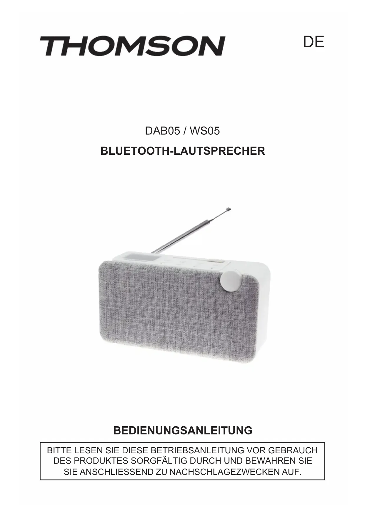 HOTLINE FRANCE, du lundi au vendredi (sauf jours fériés) : 9h00-19h00 ou support@thomsonaudiovideo.eu DEUTSCHLAND, Montag bis Sonntag von 8:00 bis 24:00 Uhr 09001-84 30 44* (0,49€/Min. aus dem deutschen Festnetz, Anrufe aus allen Mobilfunknetzen nicht möglich) oder support@bigben-interactive.de *Minderjährige müssen vorher einen Erziehungsberechtigten um Erlaubnis fragen. BELGIQUE / NEDERLAND, klantenservice@bigben-interactive.nl customerservice@bigben-interactive.be ESPAÑA, sat@bigbeninteractive.es ITALIA, support@bigbeninteractive.itDAB05 / WS05 BLUETOOTH-LAUTSPRECHER BEDIENUNGSANLEITUNG BITTE LESEN SIE DIESE BETRIEBSANLEITUNG VOR GEBRAUCH DES PRODUKTES SORGFÄLTIG DURCH UND BEWAHREN SIE SIE ANSCHLIESSEND ZU NACHSCHLAGEZWECKEN AUF. DE- DE 1 - Inhalt Warnhinweise und Vorsichtsmaßnahmen 1 Wichtige Sicherheitshinweise Produktpege 2 Umweltschutz Sicherheit und Hinweise 3 Erste Schritte Inhalt Produktbeschreibung (beide Modelle) Produktbeschreibung (nur DAB 05) 4 Produktbeschreibung (nur WS 05) Ein-/Ausschalten (nur DAB 05) Ein-/Ausschalten (nur WS 05) 5 DAB-Modus (nur DAB 05) FM-Modus (nur DAB 05) 6 FM-Modus (nur WS 05) BT-Modus (nur DAB 05) 7 BT-Modus (nur WS 05) AUX-Modus (nur DAB 05) AUX-Modus (nur WS 05) 8 INFO-Modus (nur DAB 05) MENÜ-Modus (nur DAB 05) SYSTEM (nur DAB 05) Uhrzeit einstellen (nur WS 05) 10 Radiosender speichern (nur DAB 05) Radiosender speichern (nur WS 05) Lautstärke einstellen (beide Modelle) Akku (nur DAB 05) 11 Akku (nur WS 05) Akkuladezustand (nur DAB 05) Kopfhörer (beide Modelle) Einstellen des Empfangssignals (beide Modelle) Manuelles Zurücksetzen (nur DAB 05) Sicherheitshinweise für Akkubetrieb (beide Modelle) Anmerkung 12