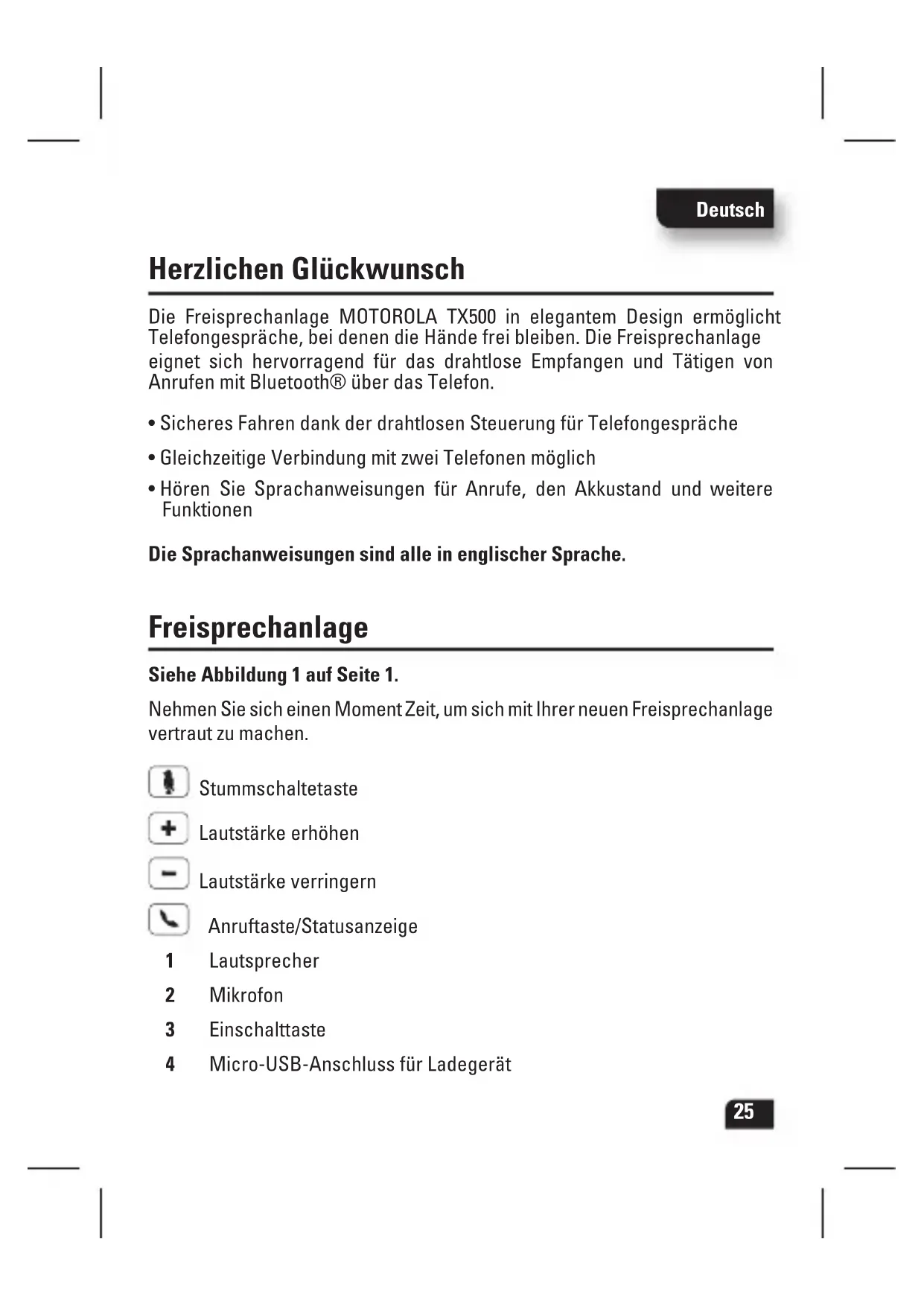 - Hören Sie Sprachanweisungen für Anrufe, den Akkustand und weitere Funktionen Die Sprachanweisungen sind alle in englischer Sprache. Freisprechanlage Siehe Abbildung 1 auf Seite 1. Nehmen Sie sich einen Moment Zeit, um sich mit Ihrer neuen Freisprechanlage vertraut zu machen. Stummschaltetaste Lautstärke erhöhen Lautstärke verringern Anruftaste/Statusanzeige 1 Lautsprecher 2 Mikrofon 3 Einschalttaste 4 Micro-USB-Anschluss für LadegerätDeutsch