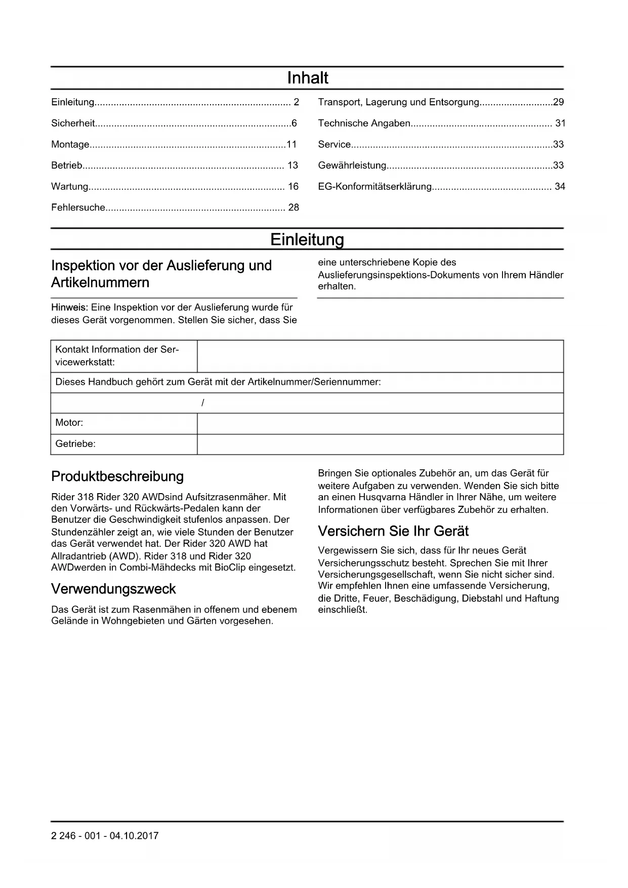 Motor: Getriebe: Produktbeschreibung Rider 318 Rider 320 AWDsind Aufsitzrasenmäher. Mit den Vorwärts- und Rückwärts-Pedalen kann der Benutzer die Geschwindigkeit stufenlos anpassen. Der Stundenzähler zeigt an, wie viele Stunden der Benutzer das Gerät verwendet hat. Der Rider 320 AWD hat Allradantrieb (AWD). Rider 318 und Rider 320 AWDwerden in Combi-Mähdecks mit BioClip eingesetzt. Verwendungszweck Das Gerät ist zum Rasenmähen in offenem und ebenem Gelände in Wohngebieten und Gärten vorgesehen. Bringen Sie optionales Zubehör an, um das Gerät für weitere Aufgaben zu verwenden. Wenden Sie sich bitte an einen Husqvarna Händler in Ihrer Nähe, um weitere Informationen über verfügbares Zubehör zu erhalten. Versichern Sie Ihr Gerät Vergewissern Sie sich, dass für Ihr neues Gerät Versicherungsschutz besteht. Sprechen Sie mit Ihrer Versicherungsgesellschaft, wenn Sie nicht sicher sind. Wir empfehlen Ihnen eine umfassende Versicherung, die Dritte, Feuer, Beschädigung, Diebstahl und Haftung einschließt. 2 246 - 001 - 04.10.2017Produktübersicht