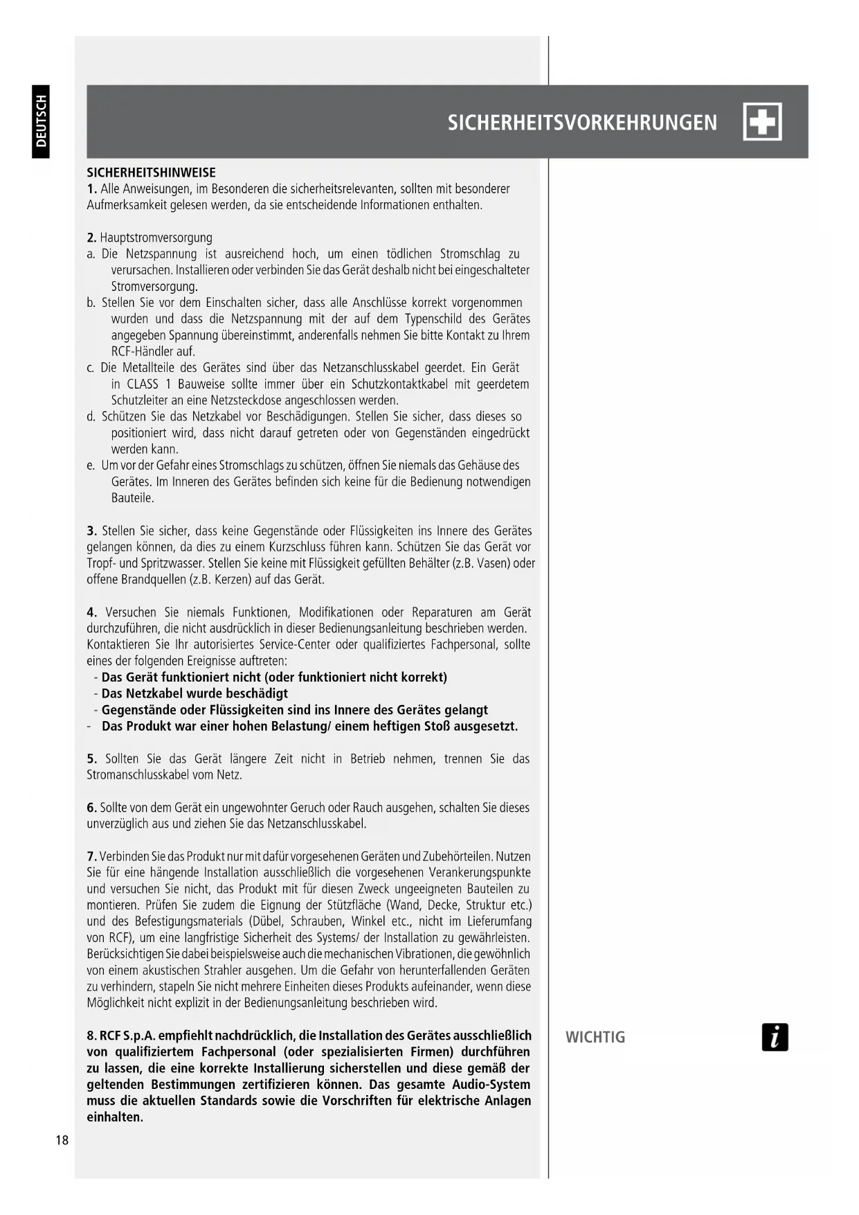 8. RCF S.p.A. empfiehlt nachdrücklich, die Installation des Gerätes ausschließlich