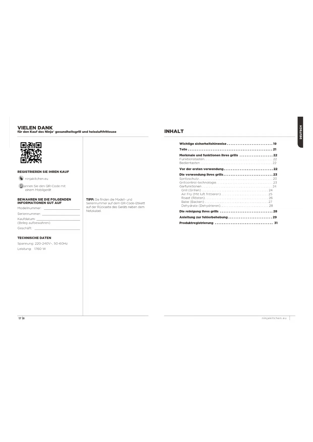 - Produktregistrierung 20 ninjakitchen.eu DEUTSCH WICHTIGE SICHERHEITSHINWEISE NUR FÜR DEN HAUSGEBRAUCH • LESEN SIE ALLE ANLEITUNGEN VOR DEM GEBRAUCH Bitte lesen Sie sorgfältig alle Anweisungen vor dem Gebrauch Ihres Ninja p. 3119