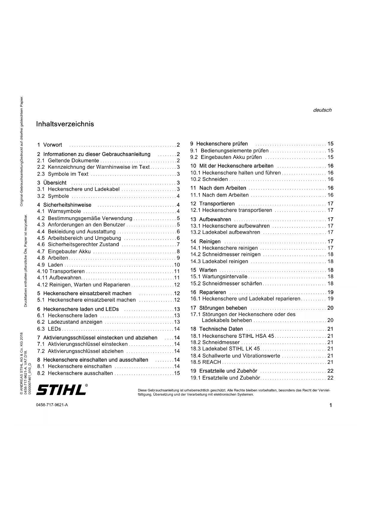 Finden Sie kostenlos die Bedienungsanleitung des Geräts HSA 45 STIHL als PDF.