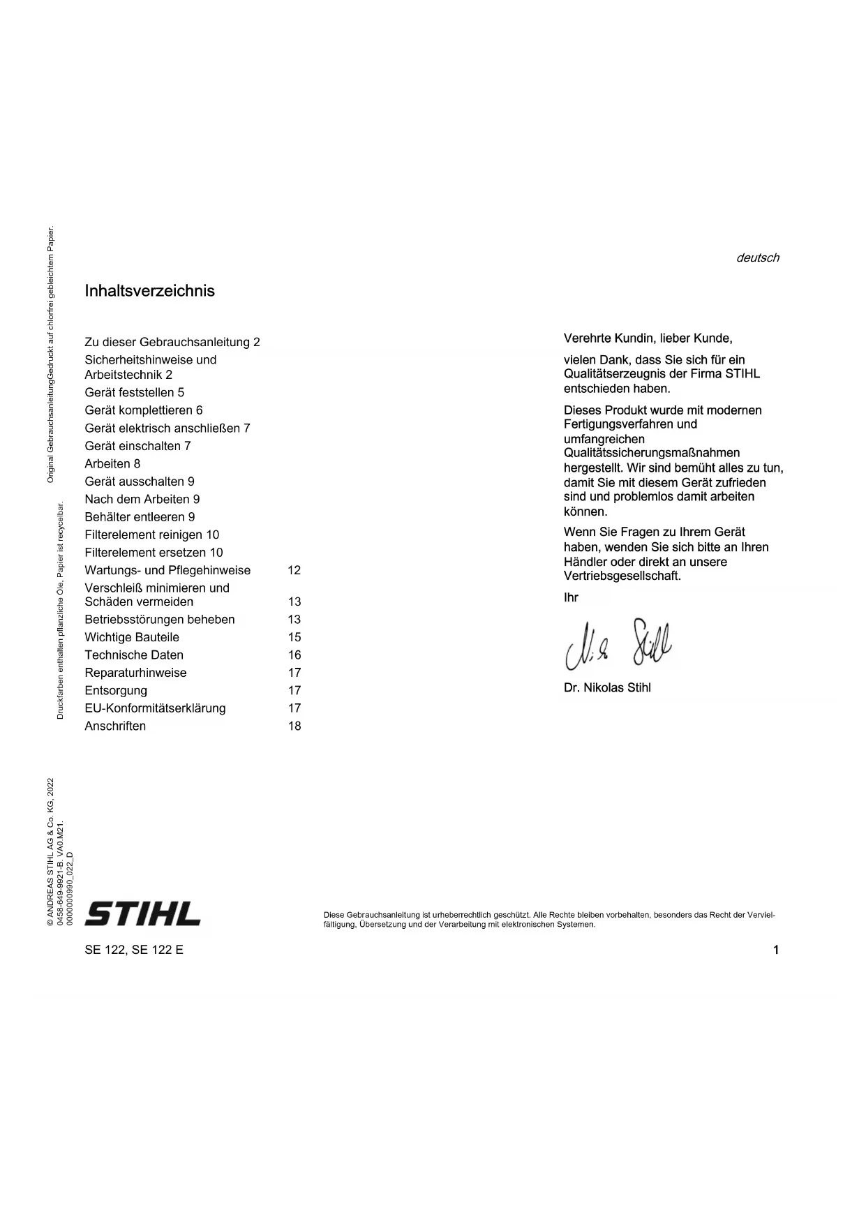 Diese Gebrauchsanleitung ist urheberrechtlich geschützt. Alle Rechte bleiben vorbehalten, besonders das Recht der Verviel- fältigung, Übersetzung und der Verarbeitung mit elektronischen Systemen. Inhaltsverzeichnis Verehrte Kundin, lieber Kunde, vielen Dank, dass Sie sich für ein Qualitätserzeugnis der Firma STIHL entschieden haben. Dieses Produkt wurde mit modernen Fertigungsverfahren und umfangreichen Qualitätssicherungsmaßnahmen hergestellt. Wir sind bemüht alles zu tun, damit Sie mit diesem Gerät zufrieden sind und problemlos damit arbeiten können. Wenn Sie Fragen zu Ihrem Gerät haben, wenden Sie sich bitte an Ihren Händler oder direkt an unsere Vertriebsgesellschaft. Ihr Dr. Nikolas Stihl Zu dieser Gebrauchsanleitung 2 Sicherheitshinweise und Arbeitstechnik 2 Gerät feststellen 5 Gerät komplettieren 6 Gerät elektrisch anschließen 7 Gerät einschalten 7 Arbeiten 8 Gerät ausschalten 9 Nach dem Arbeiten 9 Behälter entleeren 9 Filterelement reinigen 10 Filterelement ersetzen 10 Wartungs- und Pflegehinweise 12 Verschleiß minimieren und Schäden vermeiden 13 Betriebsstörungen beheben 13 Wichtige Bauteile 15 Technische Daten 16 Reparaturhinweise 17 Entsorgung 17 EU-Konformitätserklärung 17 Anschriften 18SE 122, SE 122 E deutsch