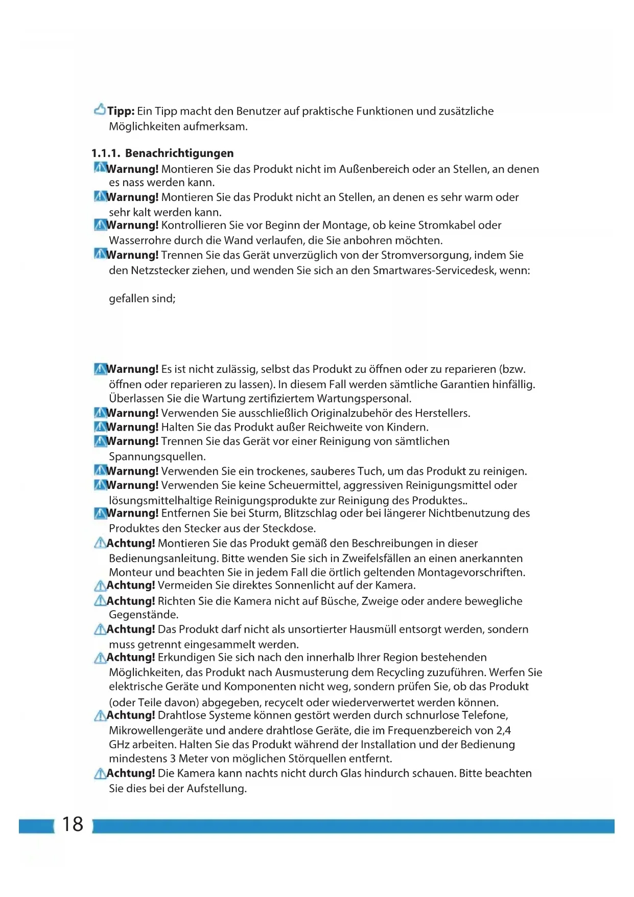 Warnung! Entfernen Sie bei Sturm, Blitzschlag oder bei längerer Nichtbenutzung des Produktes den Stecker aus der Steckdose. Achtung! Montieren Sie das Produkt gemäß den Beschreibungen in dieser Bedienungsanleitung. Bitte wenden Sie sich in Zweifelsfällen an einen anerkannten Monteur und beachten Sie in jedem Fall die örtlich geltenden Montagevorschriften. Achtung! Vermeiden Sie direktes Sonnenlicht auf der Kamera. Achtung! Richten Sie die Kamera nicht auf Büsche, Zweige oder andere bewegliche Gegenstände. Achtung! Das Produkt darf nicht als unsortierter Hausmüll entsorgt werden, sondern muss getrennt eingesammelt werden. Achtung! Erkundigen Sie sich nach den innerhalb Ihrer Region bestehenden Möglichkeiten, das Produkt nach Ausmusterung dem Recycling zuzuführen. Werfen Sie elektrische Geräte und Komponenten nicht weg, sondern prüfen Sie, ob das Produkt (oder Teile davon) abgegeben, recycelt oder wiederverwertet werden können. Achtung! Drahtlose Systeme können gestört werden durch schnurlose Telefone, Mikrowellengeräte und andere drahtlose Geräte, die im Frequenzbereich von 2,4 GHz arbeiten. Halten Sie das Produkt während der Installation und der Bedienung mindestens 3 Meter von möglichen Störquellen entfernt. Achtung! Die Kamera kann nachts nicht durch Glas hindurch schauen. Bitte beachten Sie dies bei der Aufstellung.19