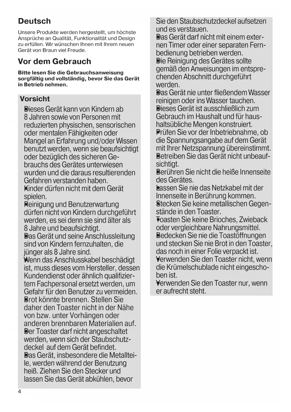 4Deutsch Unsere Produkte werden hergestellt, um höchste Ansprüche an Qualität, Funktionalität und Design zu erfüllen. Wir wünschen Ihnen mit Ihrem neuen Gerät von Braun viel Freude. Vor dem Gebrauch Bitte lesen Sie die Gebrauchsanweisung sorgfältig und vollständig, bevor Sie das Gerät in Betrieb nehmen. Vorsicht