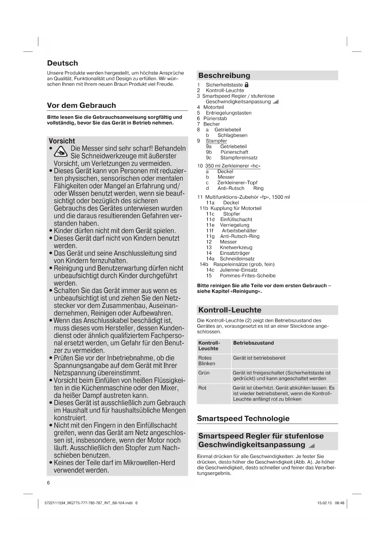 5722111534_MQ775-777-785-787_INT_S5.indd 15722111534_MQ775-777-785-787_INT_S5.indd 1 13.02.15 08:4813.02.15 08:486 Unsere Produkte werden hergestellt, um höchste Ansprüche an Qualität, Funktionalität und Design zu erfüllen. Wir wün- schen Ihnen mit Ihrem neuen Braun Produkt viel Freude. Vor dem Gebrauch Bitte lesen Sie die Gebrauchsanweisung sorgfältig und vollständig, bevor Sie das Gerät in Betrieb nehmen. Vorsicht