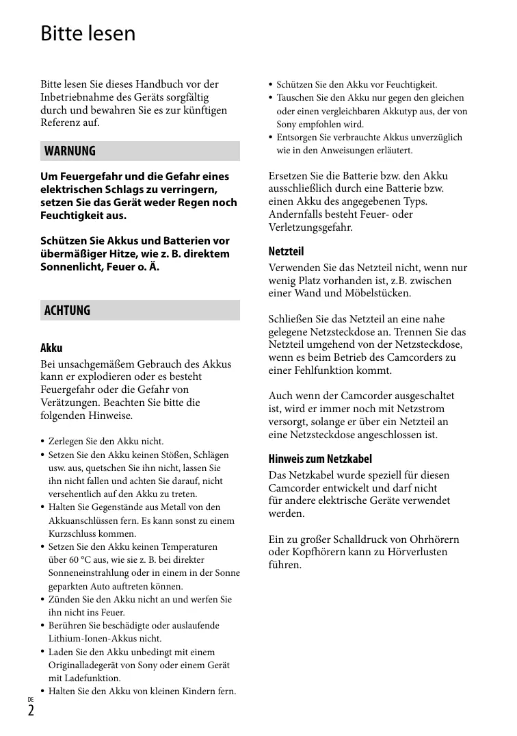 Schützen Sie den Akku vor Feuchtigkeit. Tauschen Sie den Akku nur gegen den gleichen oder einen vergleichbaren Akkutyp aus, der von Sony empfohlen wird. Entsorgen Sie verbrauchte Akkus unverzüglich wie in den Anweisungen erläutert. Ersetzen Sie die Batterie bzw. den Akku ausschließlich durch eine Batterie bzw. einen Akku des angegebenen Typs. Andernfalls besteht Feuer- oder Verletzungsgefahr. Netzteil Verwenden Sie das Netzteil nicht, wenn nur wenig Platz vorhanden ist, z.B. zwischen einer Wand und Möbelstücken. Schließen Sie das Netzteil an eine nahe gelegene Netzsteckdose an. Trennen Sie das Netzteil umgehend von der Netzsteckdose, wenn es beim Betrieb des Camcorders zu einer Fehlfunktion kommt. Auch wenn der Camcorder ausgeschaltet ist, wird er immer noch mit Netzstrom versorgt, solange er über ein Netzteil an eine Netzsteckdose angeschlossen ist. Hinweis zum Netzkabel Das Netzkabel wurde speziell für diesen Camcorder entwickelt und darf nicht für andere elektrische Geräte verwendet werden. Ein zu großer Schalldruck von Ohrhörern oder Kopfhörern kann zu Hörverlusten führen.