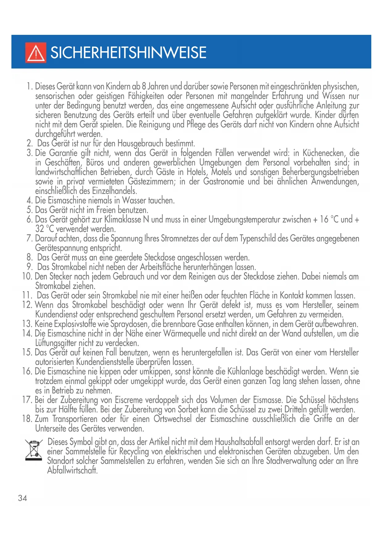 Unterseite des Gerätes verwenden. Dieses Symbol gibt an, dass der Artikel nicht mit dem Haushaltsabfall entsorgt werden darf. Er ist an einer Sammelstelle für Recycling von elektrischen und elektronischen Geräten abzugeben. Um den Standort solcher Sammelstellen zu erfahren, wenden Sie sich an Ihre Stadtverwaltung oder an Ihre Abfallwirtschaft.35 BESCHREIBUNG Vor dem Gebrauch des Gerätes bitte sorgfältig die Sicherheitshinweise lesen. Deckel Mutter Rührarm für herausnehmbaren Behälter Herausnehmbarer Behälter (2 Liter) Messbecher = 35 ml Rührarm für eingebauten Behälter Eingebauter Behälter (2 Liter) Bedienfeld Griffe an der Unterseite Vergrößerte Rückansicht Anschluss für Stromkabel Schaber Die Eismaschine verfügt über 2 Behälter (1 fest eingebauten + 1 herausnehmbaren) und 2 Rührarme (das Mittelteil des Rührarms für den eingebauten Behälter ist dünner). Das ermöglicht die Zubereitung von 2 Sorten Eis nacheinander.36 BEDIENFELD