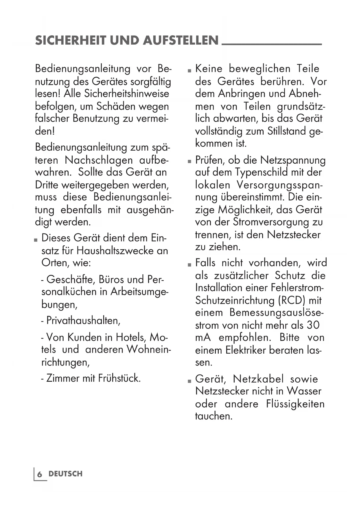Gerät, Netzkabel sowie Netzstecker nicht in Wasser oder andere Flüssigkeiten tauchen.7 DEUTSC H
