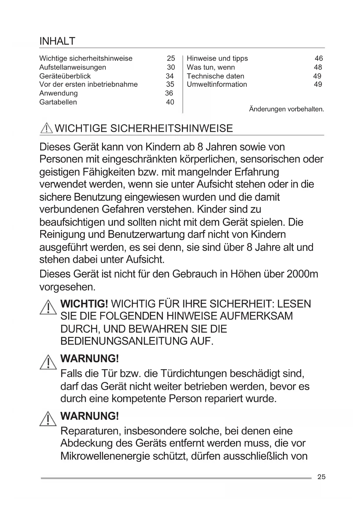 internal capacity is calculated by measuring maximum width, depth and height. actual capacity for holding food is less. enVironment ConCernS recycle materials with the symbol . Put the packaging in applicable containers to recycle it. Help protect the environment and human health and recycle waste electrical and electronic appliances. Do not dispose of appliances marked with the symbol wi th household waste. return the product to your local recycling facility or contact your municipal office. 1_Zanker_EN230_CS_BASE_Z16UICTO_Layout 1 15/06/2020 10:41 Page 2425 Dieses gerät kann von Kindern ab 8 Jahren sowie von Personen mit eingeschränkten körperlichen, sensorischen oder geistigen Fähigkeiten bzw. mit mangelnder erfahrung verwendet werden, wenn sie unter Aufsicht stehen oder in die sichere Benutzung eingewiesen wurden und die damit verbundenen gefahren verstehen. Kinder sind zu beaufsichtigen und sollten nicht mit dem gerät spielen. Die reinigung und Benutzerwartung darf nicht von Kindern ausgeführt werden, es sei denn, sie sind über 8 Jahre alt und stehen dabei unter Aufsicht. Dieses gerät ist nicht für den gebrauch in höhen über 2000m vorgesehen. WICHTIG! Wichtig FÜr ihre Sicherheit: LeSen Sie Die FOLgenDen hinWeiSe AUFMerKSAM DUrch, UnD BeWAhren Sie Die BeDienUngSAnLeitUng AUF. WARNUNG! Falls die tür bzw. die türdichtungen beschädigt sind, darf das gerät nicht weiter betrieben werden, bevor es durch eine kompetente Person repariert wurde. WARNUNG! reparaturen, insbesondere solche, bei denen eine Abdeckung des geräts entfernt werden muss, die vor Mikrowellenenergie schützt, dürfen ausschließlich von inhALt Wichtige sicherheitshinweise 25 Aufstellanweisungen 30 geräteüberblick 34 Vor der ersten inbetriebnahme 35 Anwendung 36 gartabellen 40 hinweise und tipps 46 Was tun, wenn 48 technische daten 49 Umweltinformation 49 Änderungen vorbehalten. Wichtige SicherheitShinWeiSe 2_Zanker_German_CS_BASE Z16UICTO_Layout 1 15/06/2020 10:12 Page 2526 entsprechend qualifizierten technikern vorgenommen werden. WARNUNG! Speisen in flüssiger und anderer Form dürfen nicht in verschlossenen gefäßen erhitzt werden, da sie explodieren könnten. Dieses gerät ist für die Benutzung im haushalt und für ähnliche Anwendungen ausgelegt, wie zum Beispiel: Personal- Küchenbereiche in geschäften, Büros und anderen Arbeitsumge-bungen; Bauernhäuser; zur Verwendung durch Kunden in hotels, Motels und anderen Wohnumfeldern; in Pensionen und ähnlichen Beherbergungsbetrieben. nur für Mikrowellengeräte vorgesehene Behälter und geschirr verwenden. Metallbehälter für Lebensmittel und getränke sind für das Kochen in der Mikrowelle nicht erlaubt. niemals das gerät unbeaufsichtigt lassen, wenn Kunststoff-, Papier- oder andere brennbare Lebensmittelbehälter verwendet werden. Der Mikrowellenherd ist nur für das erwärmen von nahrungsmitteln und getränken vorgesehen. Das trocknen von nahrungsmitteln oder Bekleidung und das erwärmen von Wärmekissen, hausschuhen, Schwämmen, feuchten tüchern und ähnlichen Produkten kann ein Verletzungs-, entzündungs- oder Brandrisiko verursachen. nieMALS Die tÜr ÖFFnen, wenn im gerät erwärmte Lebensmittel zu rauchen beginnen. Das gerät ausschalten, den netzstecker ziehen und warten, bis die Lebensmittel nicht mehr rauchen. Öffnen der tür während der r auchentwicklung kann Feuer verursachen. Beim erhitzen von Flüssigkeiten in Mikrowellengeräten beim entnehmen des Behälters vorsichtig sein, da es zu einem 2_Zanker_German_CS_BASE Z16UICTO_Layout 1 15/06/2020 10:12 Page 2627 verspätetem Aufwallen durch Siedeverzug kommen kann. Der inhalt von Saugflaschen und Babynahrungsbehältnissen sollte vor dem gebrauch geschüttelt bzw. gerührt und die temperatur sollte vor dem Verzehr geprüft werden, um Verbrennungen zu vermeiden. eier nicht in der Schale kochen. hartgekochte eier dürfen nicht in Mikrowellengeräten erwärmt werden, da sie selbst nach der erwärmung explodieren können. Reinigung & pflege gerätetür: Die tür, die türdichtung und die Dichtungsoberflächen des öfteren mit einem feuchten tuch abwischen, um Verschmutzungen zu entfernen. Keine starken, scheuernden reinigungsmittel oder Metallschaber zum reinigen der glasscheibe des geräts verwenden, da diese hilfsmittel die Oberfläche verkratzen und das glas somit zum Zerspringen bringen könnten. geräteinnenraum: nach jedem gebrauch das noch warme gerät zur reinigung mit einem weichen, feuchten tuch oder Schwamm abwischen, um leichte Verschmutzungen zu entfernen. Für starke Verschmutzungen eine milde Seifenlauge verwenden und mehrmals mit einem weichen, feuchten tuch oder Schwamm gründlich nachwischen, bis alle rückstände vollständig entfernt sind. entfernen Sie nicht den Spritzschutz für den hohlleiter. Sicherstellen, dass weder Seifenlauge noch Wasser durch die kleinen Öffnungen an der Wand eindringen, da dies das gerät beschädigen kann. Verwenden Sie keine Sprühreiniger im garraum. Den Spritzschutz für den hohlleiter, den garraum, den Drehteller und den Drehteller-träger nach der Verwendung 2_Zanker_German_CS_BASE Z16UICTO_Layout 1 15/06/2020 10:12 Page 2728 des gerätes reinigen. Diese Bauteile sollten trocken und fettfrei sein. Zurückbleibende Fettspritzer können überhitzen, zu rauchen beginnen oder sich entzünden. gerätegehäuse: Die Außenseite des gerätes mit einer milden Seifenlauge reinigen. Die Seifenlauge gründlich mit einem feuchten tuch abwischen und mit einem handtuch nachtrocknen. Bedienfeld: Vor dem reinigen die tür öffnen, um das Bedienfeld zu inaktivieren. Das Bedienfeld vorsichtig mit einem feuchten tuch reinigen. niemals zuviel Wasser und keine chemischen oder scheuernden reiniger verwenden, da das Bedienfeld dadurch beschädigt werden kann. Drehteller und drehteller-träger: entfernen Sie zuerst den Drehteller und den Drehteller-träger aus dem garraum. Den Drehteller und den träger mit einer milden Seifenlauge reinigen und mit einem wei