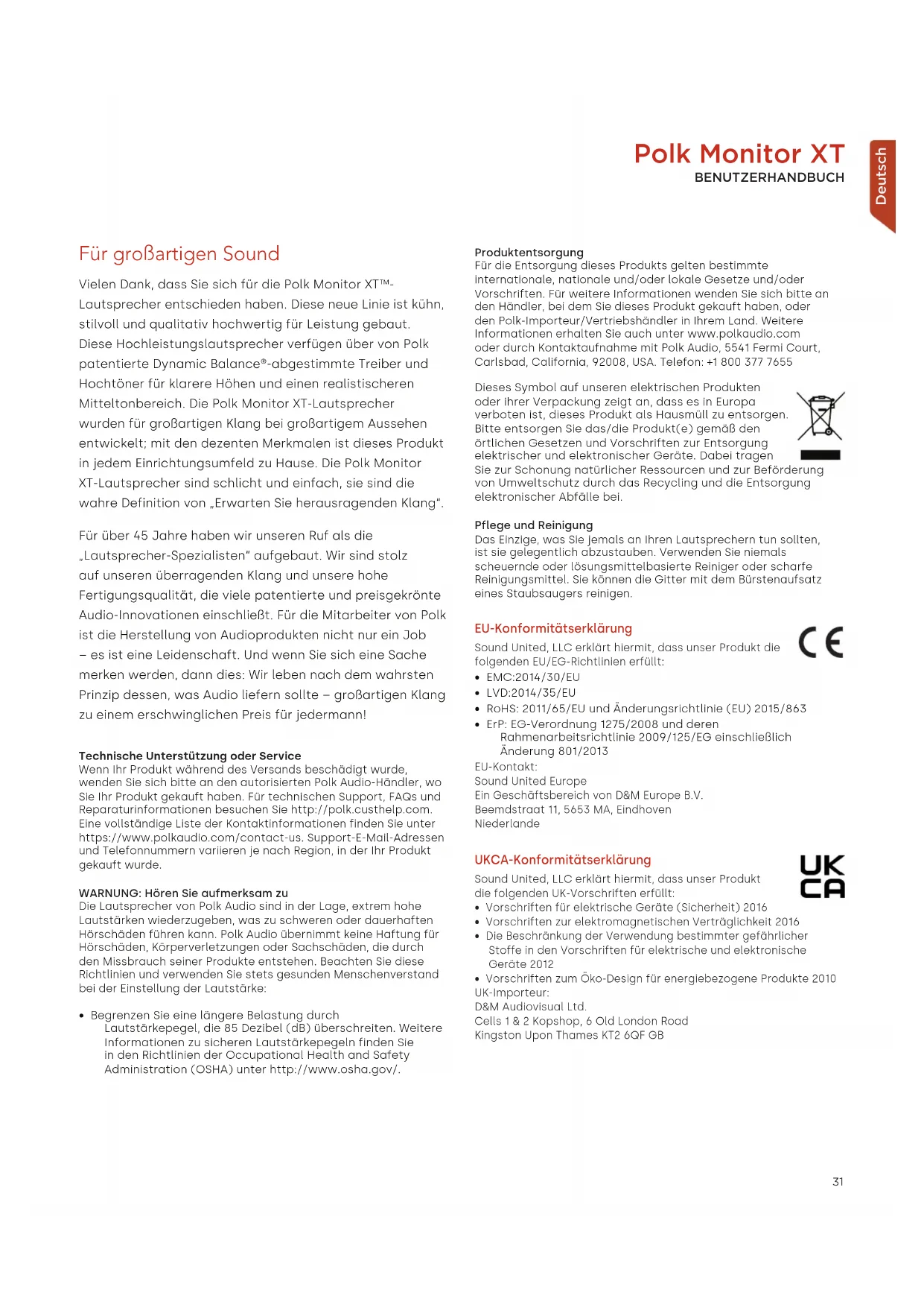 - Begrenzen Sie eine längere Belastung durch Lautstärkepegel, die 85 Dezibel (dB) überschreiten. Weitere Informationen zu sicheren Lautstärkepegeln finden Sie in den Richtlinien der Occupational Health and Safety Administration (OSHA) unter http://www.osha.gov/. Produktentsorgung Für die Entsorgung dieses Produkts gelten bestimmte internationale, nationale und/oder lokale Gesetze und/oder Vorschriften. Für weitere Informationen wenden Sie sich bitte an den Händler, bei dem Sie dieses Produkt gekauft haben, oder den Polk-Importeur/Vertriebshändler in Ihrem Land. Weitere Informationen erhalten Sie auch unter www.polkaudio.com oder durch Kontaktaufnahme mit Polk Audio, 5541 Fermi Court, Carlsbad, California, 92008, USA. Telefon: +1 800 377 7655 Dieses Symbol auf unseren elektrischen Produkten oder ihrer Verpackung zeigt an, dass es in Europa verboten ist, dieses Produkt als Hausmüll zu entsorgen. Bitte entsorgen Sie das/die Produkt(e) gemäß den örtlichen Gesetzen und Vorschriften zur Entsorgung elektrischer und elektronischer Geräte. Dabei tragen Sie zur Schonung natürlicher Ressourcen und zur Beförderung von Umweltschutz durch das Recycling und die Entsorgung elektronischer Abfälle bei. Pflege und Reinigung Das Einzige, was Sie jemals an Ihren Lautsprechern tun sollten, ist sie gelegentlich abzustauben. Verwenden Sie niemals scheuernde oder lösungsmittelbasierte Reiniger oder scharfe Reinigungsmittel. Sie können die Gitter mit dem Bürstenaufsatz eines Staubsaugers reinigen. EU-Konformitätserklärung Sound United, LLC erklärt hiermit, dass unser Produkt die folgenden EU/EG-Richtlinien erfüllt: