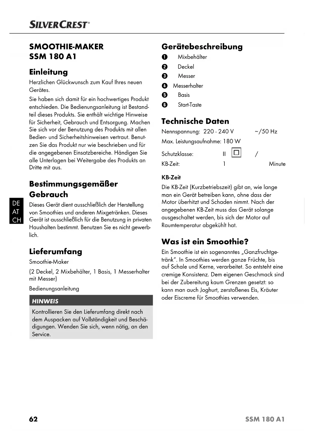 /50 Hz Max. Leistungsaufnahme: 180 W Schutzklasse: II / KB-Zeit: 1 Minute KB-Zeit Die KB-Zeit (Kurzbetriebszeit) gibt an, wie lange man ein Gerät betreiben kann, ohne dass der Motor überhitzt und Schaden nimmt. Nach der angegebenen KB-Zeit muss das Gerät solange ausgeschaltet werden, bis sich der Motor auf Raumtemperatur abgekühlt hat. Was ist ein Smoothie? Ein Smoothie ist ein sogenanntes „Ganzfruchtge- tränk“. In Smoothies werden ganze Früchte, bis auf Schale und Kerne, verarbeitet. So entsteht eine cremige Konsistenz. Dem eigenen Geschmack sind bei der Zubereitung kaum Grenzen gesetzt: so kann man auch Joghurt, zerstoßenes Eis, Kräuter oder Eiscreme für Smoothies verwenden.63 SSM 180 A1