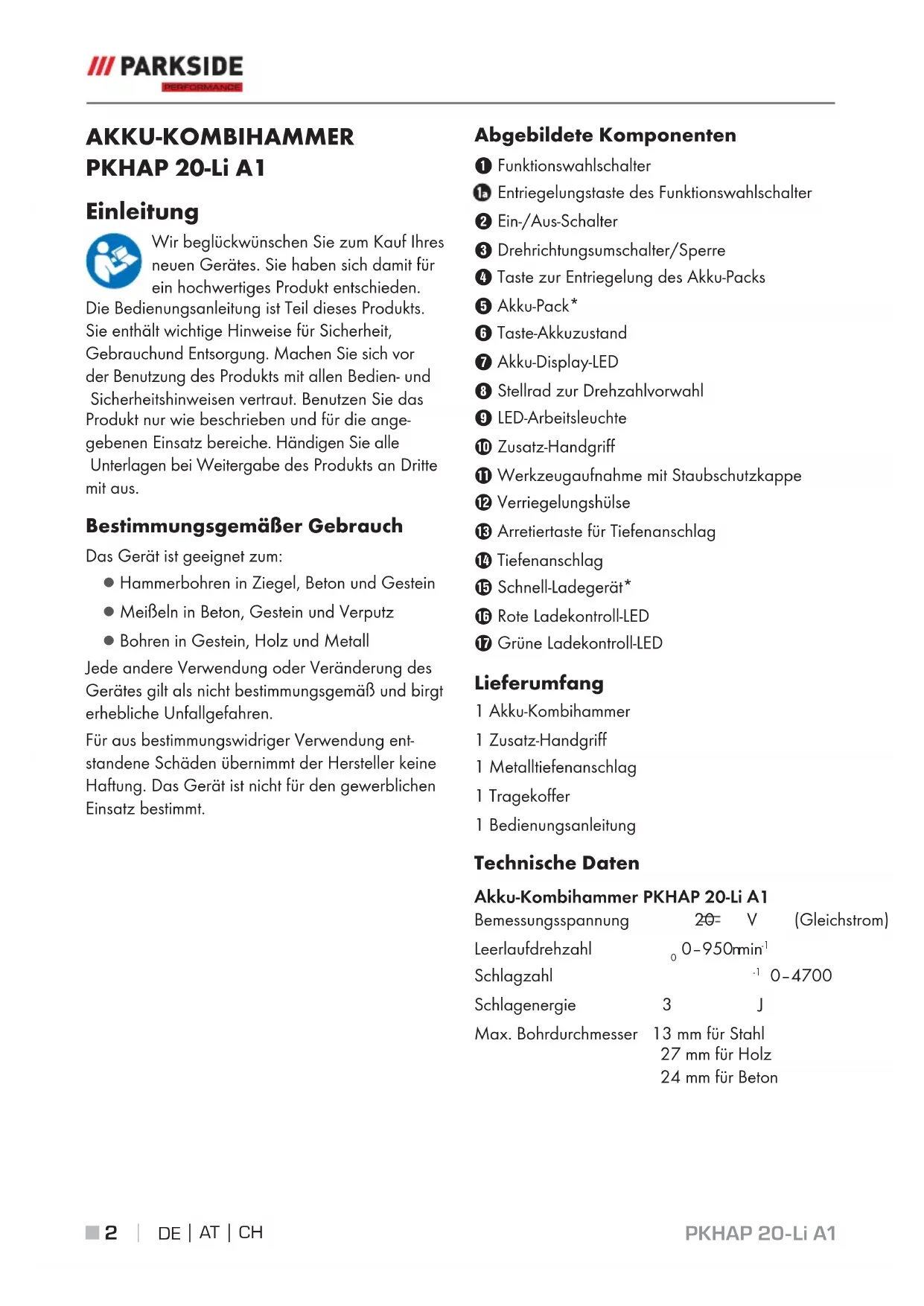 AKKU-KOMBIHAMMER PKHAP 20-Li A1 Einleitung Wir beglückwünschen Sie zum Kauf Ihres neuen Gerätes. Sie haben sich damit für ein hochwertiges Produkt entschieden. Die Bedienungsanleitung ist Teil dieses Produkts. Sie enthält wichtige Hinweise für Sicherheit, Gebrauch und Entsorgung. Machen Sie sich vor der Benutzung des Produkts mit allen Bedien- und Sicherheitshinweisen vertraut. Benutzen Sie das Produkt nur wie beschrieben und für die ange- gebenen Einsatz bereiche. Händigen Sie alle Unterlagen bei Weitergabe des Produkts an Dritte mit aus. Bestimmungsgemäßer Gebrauch Das Gerät ist geeignet zum: ▯ Hammerbohren in Ziegel, Beton und Gestein ▯ Meißeln in Beton, Gestein und Verputz ▯ Bohren in Gestein, Holz und Metall Jede andere Verwendung oder Veränderung des Gerätes gilt als nicht bestimmungsgemäß und birgt erhebliche Unfallgefahren. Für aus bestimmungswidriger Verwendung ent- standene Schäden übernimmt der Hersteller keine Haftung. Das Gerät ist nicht für den gewerblichen Einsatz bestimmt. Abgebildete Komponenten Funktionswahlschalter Entriegelungstaste des Funktionswahlschalter Ein-/Aus-Schalter Drehrichtungsumschalter/Sperre Taste zur Entriegelung des Akku-Packs Akku-Pack* Taste-Akkuzustand Akku-Display-LED Stellrad zur Drehzahlvorwahl LED-Arbeitsleuchte Zusatz-Handgriff - Werkzeugaufnahme mit Staubschutzkappe 3 Verriegelungshülse ! Arretiertaste für Tiefenanschlag . Tiefenanschlag 0 Schnell-Ladegerät* 6 Rote Ladekontroll-LED 1 Grüne Ladekontroll-LED Lieferumfang 1 Akku-Kombihammer 1 Zusatz-Handgriff 1 Metalltiefenanschlag 1 Tragekoffer 1 Bedienungsanleitung Technische Daten Akku-Kombihammer PKHAP 20-Li A1 Bemessungsspannung 20 V (Gleichstrom) Leerlaufdrehzahl n