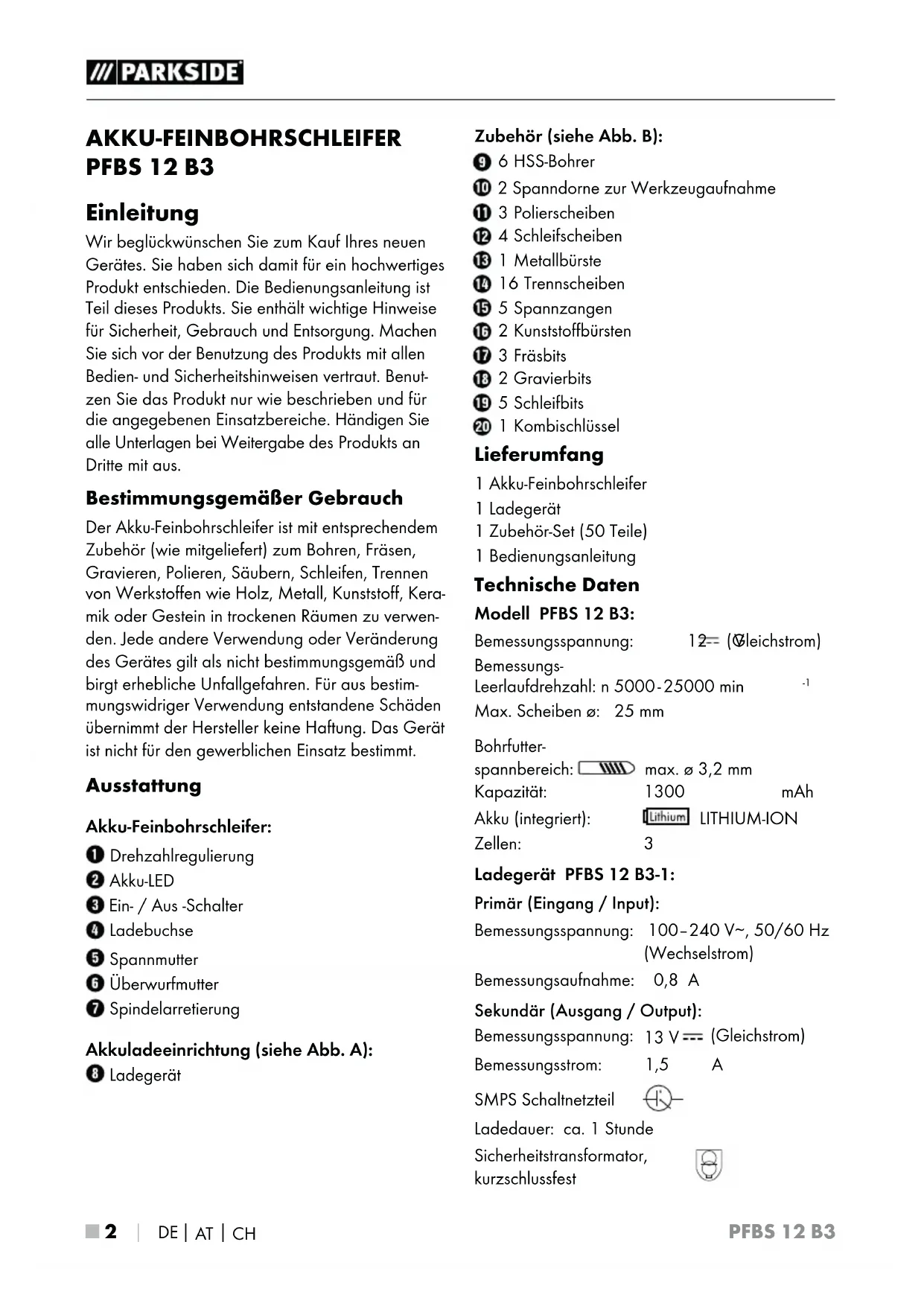 Max. Scheiben ø: 25 mm Bohrfutter- spannbereich: max. ø 3,2 mm Kapazität: 1300 mAh Akku (integriert): LITHIUM-ION Zellen: 3 Ladegerät PFBS 12 B3-1: Primär (Eingang / Input): Bemessungsspannung: 100–240 V∼, 50/60 Hz (Wechselstrom) Bemessungsaufnahme: 0,8 A Sekundär (Ausgang / Output): Bemessungsspannung: 13 V (Gleichstrom) Bemessungsstrom: 1,5 A SMPS Schaltnetzteil Ladedauer: ca. 1 Stunde Sicherheitstransformator, kurzschlussfestPFBS 12 B3