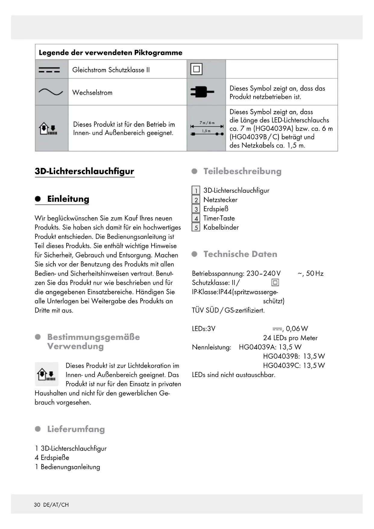 Sie das Produkt nicht in der Ver- packung. Verwenden Sie das Produkt nur mit den in dieser Anleitung be- schriebenen Bauteilen. Bei längerer Nichtnutzung (z. B. Urlaub) trennen Sie das Produkt vom Stromnetz. Halten Sie das Produkt von T eichen und anderen Wasserreservoirs fern. Installieren Sie das Produkt mindestens 2 m von Wasserbe- hältern entfernt. Meiden Sie Plä tze, welche nach starken Regenfällen überflutet werden können. Verwenden Sie das Produkt im Außenbereich nur an einer Steckdose, welche mittels eines Fehlerstromschutzschalters (FI o der RCD) mit einem maximalen Feh- lerstrom von 30 mA gesichert ist. Beachten Sie, dass der Netz- stecker / das Netzteil auch ohne Betrieb des Produkts noch eine geringe Leistung aufnimmt, so- lange sich der Netzstecker / das Netzteil in der Steckdose befind et. Zum vollständigen Ausschalten entfernen Sie den Netzstecker / das Netzteil aus der Steckdose. Nicht in Ausbuchtungen in Ober- flächen einsetzen. Außenliegende Steckdosen müssen für den Außenbereich geeignet sein und sollten sich mindestens 2,5 m vom nächsten Wasserbehälter oder Wasserre- servoir befinden.33 DE/AT/CH Das Produkt ist spritzwasserge- schützt (IP44). Diese Schutzart bleibt nur erhalten, wenn die ver- wendete Steckdose mindestens diese Schutzart erfüllt. Stellen Sie sicher, dass das Produkt nicht durch Bereiche ge- führt wird, in denen Rasenmäher, Trimmer, Scheren oder ähnlich schneidende Werkzeuge ver- wendet werden. Stellen Sie sicher, dass das Pro- dukt so verlegt ist, dass niemand darüber laufen bzw. stolpern kann. Wenn Sie Fragen zum Produkt haben oder sich nicht sicher sind, fragen Sie einen Elektrofachbe- trieb um Rat. Vor der Inbetriebnahme Hinweis: Entfernen Sie sämtliches Verpackungs- material vom Produkt. Montage Platzieren Sie die 3D-Lichterschlauchfigur
