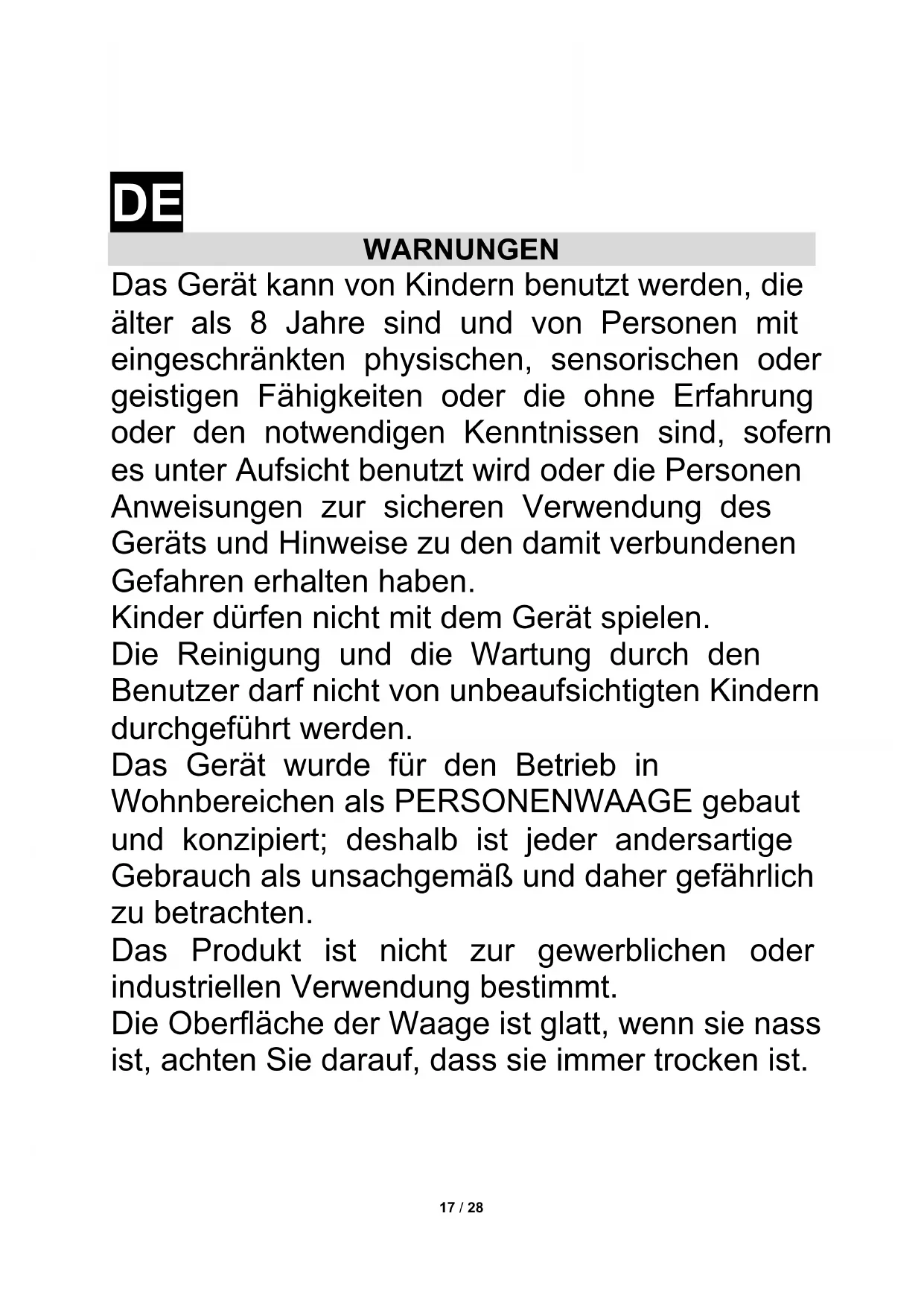 WARNUNGEN Das Gerät kann von Kindern benutzt werden, die älter als 8 Jahre sind und von Personen mit eingeschränkten physischen, sensorischen oder geistigen Fähigkeiten oder die ohne Erfahrung oder den notwendigen Kenntnissen sind, sofern es unter Aufsicht benutzt wird oder die Personen Anweisungen zur sicheren Verwendung des Geräts und Hinweise zu den damit verbundenen Gefahren erhalten haben. Kinder dürfen nicht mit dem Gerät spielen. Die Reinigung und die Wartung durch den Benutzer darf nicht von unbeaufsichtigten Kindern durchgeführt werden. Das Gerät wurde für den Betrieb in Wohnbereichen als PERSONENWAAGE gebaut und konzipiert; deshalb ist jeder andersartige Gebrauch als unsachgemäß und daher gefährlich zu betrachten. Das Produkt ist nicht zur gewerblichen oder industriellen Verwendung bestimmt. Die Oberfläche der Waage ist glatt, wenn sie nass ist, achten Sie darauf, dass sie immer trocken ist.18 / 28