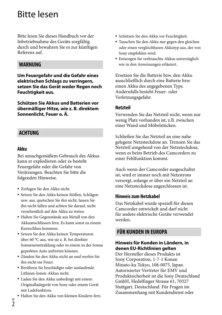 Bitte lesen Bitte lesen Sie dieses Handbuch vor der Inbetriebnahme des Geräts sorgfältig durch und bewahren Sie es zur künftigen Referenz auf. WARNUNG Um Feuergefahr und die Gefahr eines elektrischen Schlags zu verringern, setzen Sie das Gerät weder Regen noch Feuchtigkeit aus. Schützen Sie Akkus und Batterien vor übermäßiger Hitze, wie z. B. direktem Sonnenlicht, Feuer o. Ä. ACHTUNG Akku Bei unsachgemäßem Gebrauch des Akkus kann er explodieren oder es besteht Feuergefahr oder die Gefahr von Verätzungen. Beachten Sie bitte die folgenden Hinweise.