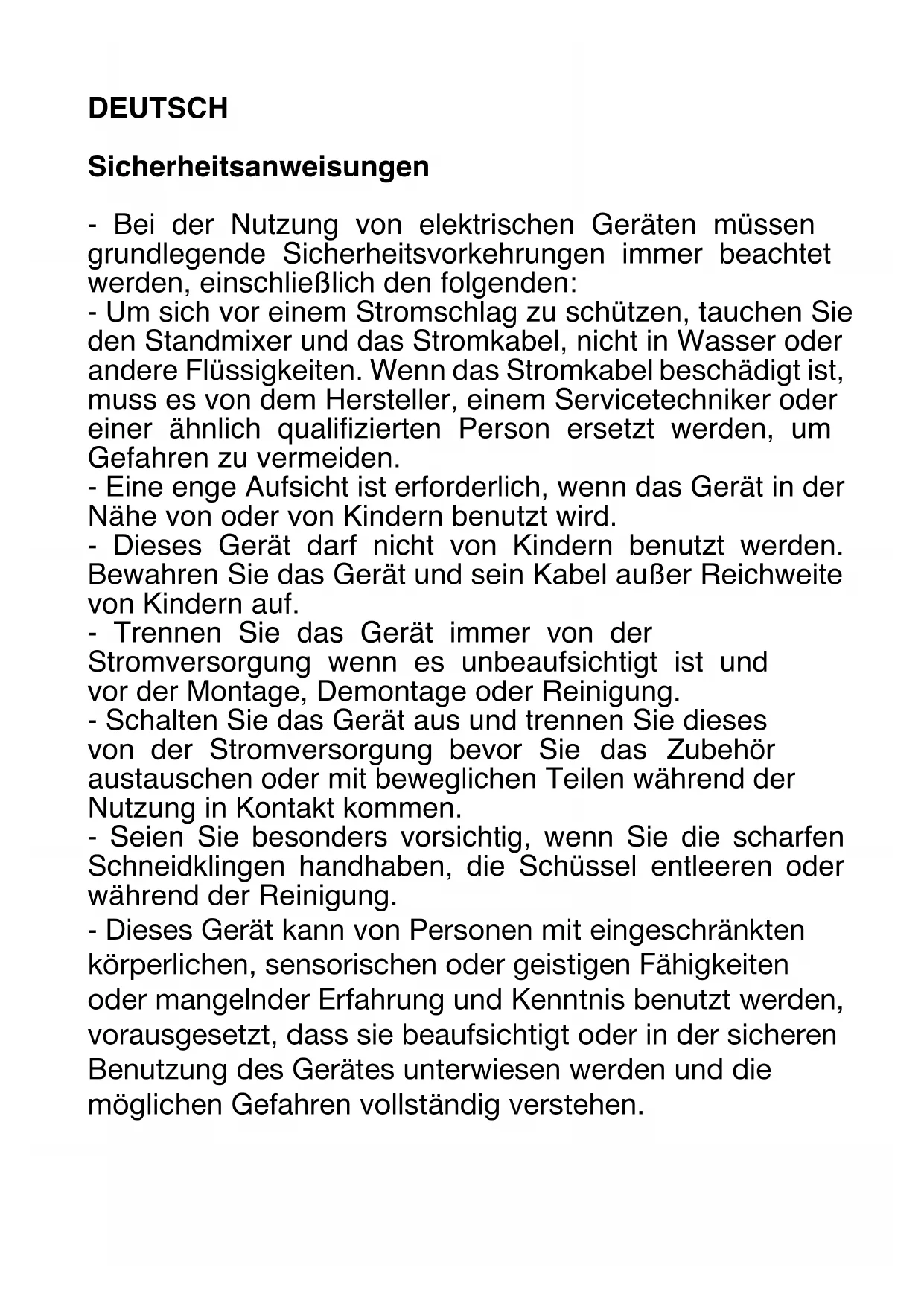 Adeva SAS / H.Koenig Europe - 8 rue Marc Seguin, 77290 Mitry-Mory, France www.hkoenig.com - https://sav.hkoenig.com - Tél: +33 1 64 67 00 05DEUTSCH Sicherheitsanweisungen - Bei der Nutzung von elektrischen Geräten müssen grundlegende Sicherheitsvorkehrungen immer beachtet werden, einschließlich den folgenden: - Um sich vor einem Stromschlag zu schützen, tauchen Sie den Standmixer und das Stromkabel, nicht in Wasser oder andere Flüssigkeiten. Wenn das Stromkabel beschädigt ist, muss es von dem Hersteller, einem Servicetechniker oder einer ähnlich qualifizierten Person ersetzt werden, um Gefahren zu vermeiden. - Eine enge Aufsicht ist erforderlich, wenn das Gerät in der Nähe von oder von Kindern benutzt wird. - Dieses Gerät darf nicht von Kindern benutzt werden. Bewahren Sie das Gerät und sein Kabel außer Reichweite von Kindern auf. - Trennen Sie das Gerät immer von der Stromversorgung wenn es unbeaufsichtigt ist und vor der Montage, Demontage oder Reinigung. - Schalten Sie das Gerät aus und trennen Sie dieses von der Stromversorgung bevor Sie das Zubehör austauschen oder mit beweglichen Teilen während der Nutzung in Kontakt kommen. - Seien Sie besonders vorsichtig, wenn Sie die scharfen Schneidklingen handhaben, die Schüssel entleeren oder während der Reinigung. - Dieses Gerät kann von Personen mit eingeschränkten körperlichen, sensorischen oder geistigen Fähigkeiten oder mangelnder Erfahrung und Kenntnis benutzt werden, vorausgesetzt, dass sie beaufsichtigt oder in der sicheren Benutzung des Gerätes unterwiesen werden und die möglichen Gefahren vollständig verstehen.- Trennen Sie das Gerät beim Nichtgebrauch von der Steckdose, bevor Sie die Teile montieren oder abnehmen, und vor der Reinigung. - Vermeiden Sie den Kontakt mit beweglichen Teilen. Halten Sie ihre Hände, Kleidungsstücke, genauso wie Spatel und andere Utensilien während des Betriebs von den Treibern fern, um Körperverletzungen und/oder Beschädigungen des Gerätes zu vermeiden. - Bedienen Sie das Gerät nicht, wenn das Kabel oder der Stecker beschädigt sind, nach einer Fehlfunktion des Gerätes, nachdem es fallen gelassen oder auf jeglicher Weise beschädigt worden ist. Bringen Sie das Gerät zu nächstliegender autorisierter Servicestelle für eine Inspektion, Reparatur oder eine elektrische oder mechanische Anpassung. - Die Nutzung des Zubehörs, das nicht von dem Hersteller empfohlen oder verkauft wurde, kann zu einem Brand, einem Stromschlag oder einer Verletzung führen. - Benutzen Sie das Gerät nicht draußen. Dieses Produkt ist ausschließlich für die Haushaltsnutzung geeignet. - Lassen Sie das Kabel über die Kante eines Tisches oder einer Theke nicht herunterhängen. - Entfernen Sie die Treiber vor der Reinigung. - Das Gerät kann durch Kinder ab 8 Jahren benutzt werden, wenn sie beaufsichtigt werden oder erhielten Anweisungen, wie das Gerät zu benutzen ist und kennen die damit angebundenen Gefahren. - Die Reinigung und Wartung dürfen nicht von Kindern durchgeführt werden, es sei denn sie sind über 8 Jahre alt und werden von einem Erwachsenen beaufsichtigt. - Bewahren Sie das Gerät und sein Kabel außer Reichweite von Kindern unter 8 Jahren auf. - Während der Nutzung von elektrischen Geräten müssen grundliegende Sicherheitsvorkehrungen immer befolgt werden, um das Risiko eines Brandes, einesStromschlages oder/und einer Verletzung im Falle eines Missbrauchs zu vermeiden. - Vergewissern Sie sich bitte, ob die Spannung auf demTypenschild mit der Netzspannung Ihrer Einrichtung übereinstimmt. Wenn dies nicht der Fall ist, kontaktieren Sie den Händler und schließen Sie das Gerät nicht an. - Bewahren Sie diese Anleitung als künftige Referenz auf und geben Sie diese an künftige Nutzer zusammen mit dem Gerät weiter. - Das Gerät darf nur im Haushalt und in Innenräumen benutzt werden. - Ihr Gerät ist nur für den Hausgebrauch bestimmt. Es ist nicht für die Verwendung in den folgenden Situationen vorgesehen, die nicht von der Garantie abgedeckt sind: - in Personalküchen in Geschäften, Büros und anderen professionellen Umgebungen, - in Landgasthöfen, - von Gästen in Hotels, Motels und anderen Wohnumgebungen, - in Bed-and-Breakfast-Umgebungen.
