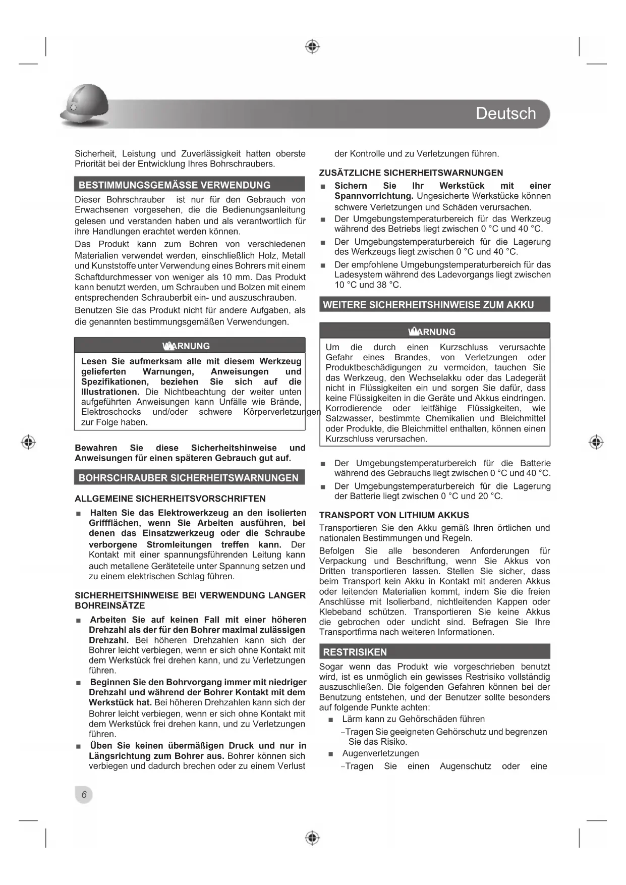 Dieser Bohrschrauber ist nur für den Gebrauch von Erwachsenen vorgesehen, die die Bedienungsanleitung gelesen und verstanden haben und als verantwortlich für ihre Handlungen erachtet werden können. Das Produkt kann zum Bohren von verschiedenen Materialien verwendet werden, einschließlich Holz, Metall und Kunststoffe unter Verwendung eines Bohrers mit einem Schaftdurchmesser von weniger als 10 mm. Das Produkt kann benutzt werden, um Schrauben und Bolzen mit einem entsprechenden Schrauberbit ein- und auszuschrauben. Benutzen Sie das Produkt nicht für andere Aufgaben, als die genannten bestimmungsgemäßen Verwendungen. WARNUNG Lesen Sie aufmerksam alle mit diesem Werkzeug gelieferten Warnungen, Anweisungen und Spezifikationen, beziehen Sie sich auf die Illustrationen. Die Nichtbeachtung der weiter unten aufgeführten Anweisungen kann Unfälle wie Brände,