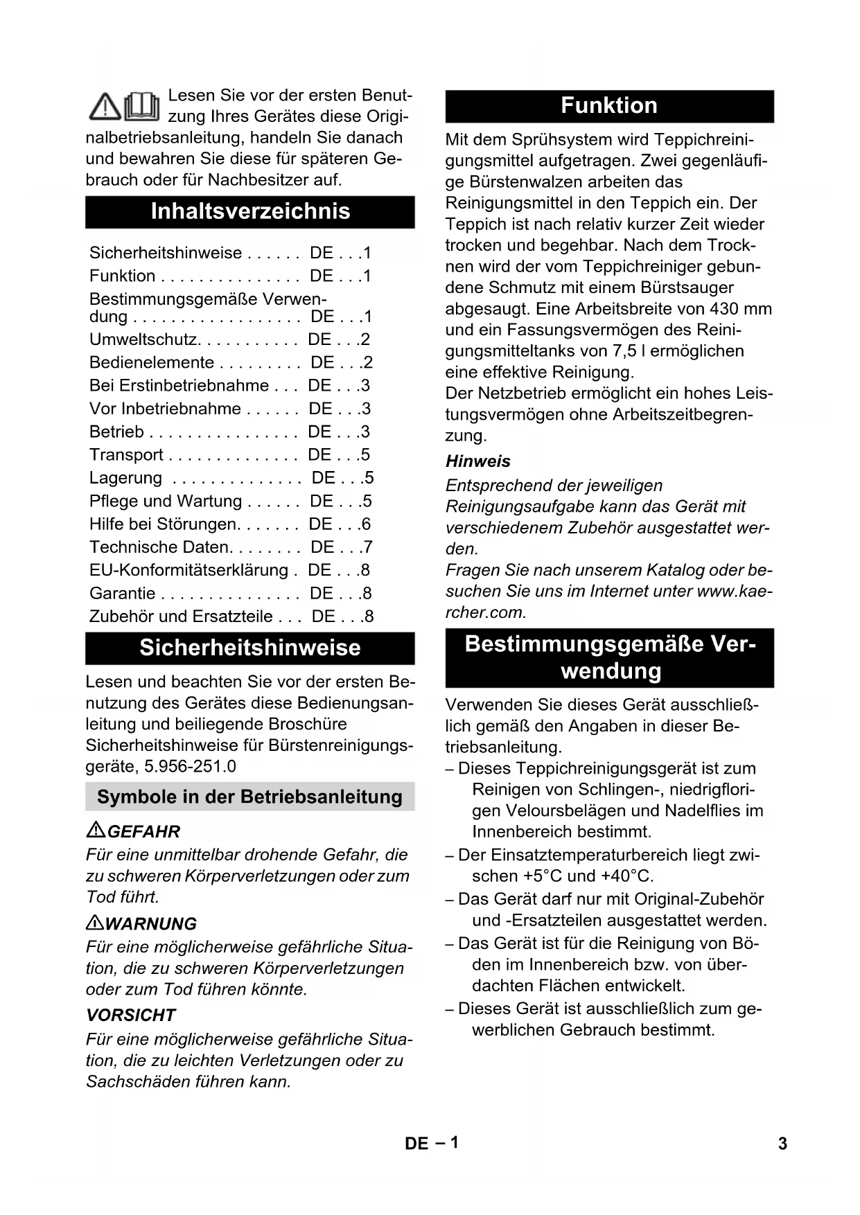 - 59622120 04/19 Deutsch 3 English 11 Français 19 Italiano 27 Nederlands 35 Español 43 Português 51 Dansk 59 Norsk 67 Svenska 75 Suomi 83 Ελληνικά 91 Türkçe 99 Русский 107 Magyar 115 Čeština 123 Slovenščina 131 Polski 139 Româneşte 147 Slovenčina 155 Hrvatski 163 Srpski 171 Български 179 Eesti 187 Latviešu 195 Lietuviškai 203 Українська 2112– 1 Lesen Sie vor der ersten Benut- zung Ihres Gerätes diese Origi- nalbetriebsanleitung, handeln Sie danach und bewahren Sie diese für späteren Ge- brauch oder für Nachbesitzer auf. Lesen und beachten Sie vor der ersten Be- nutzung des Gerätes diese Bedienungsan- leitung und beiliegende Broschüre Sicherheitshinweise für Bürstenreinigungs- geräte, 5.956-251.0 GEFAHR Für eine unmittelbar drohende Gefahr, die zu schweren Körperverletzungen oder zum Tod führt. 몇 WARNUNG Für eine möglicherweise gefährliche Situa- tion, die zu schweren Körperverletzungen oder zum Tod führen könnte. VORSICHT Für eine möglicherweise gefährliche Situa- tion, die zu leichten Verletzungen oder zu Sachschäden führen kann. Mit dem Sprühsystem wird Teppichreini- gungsmittel aufgetragen. Zwei gegenläufi- ge Bürstenwalzen arbeiten das Reinigungsmittel in den Teppich ein. Der Teppich ist nach relativ kurzer Zeit wieder trocken und begehbar. Nach dem Trock- nen wird der vom Teppichreiniger gebun- dene Schmutz mit einem Bürstsauger abgesaugt. Eine Arbeitsbreite von 430 mm und ein Fassungsvermögen des Reini- gungsmitteltanks von 7,5 l ermöglichen eine effektive Reinigung. Der Netzbetrieb ermöglicht ein hohes Leis- tungsvermögen ohne Arbeitszeitbegren- zung. Hinweis Entsprechend der jeweiligen Reinigungsaufgabe kann das Gerät mit verschiedenem Zubehör ausgestattet wer- den. Fragen Sie nach unserem Katalog oder be- suchen Sie uns im Internet unter www.kae- rcher.com. Verwenden Sie dieses Gerät ausschließ- lich gemäß den Angaben in dieser Be- triebsanleitung. – Dieses Teppichreinigungsgerät ist zum Reinigen von Schlingen-, niedrigflori- gen Veloursbelägen und Nadelflies im Innenbereich bestimmt. – Der Einsatztemperaturbereich liegt zwi- schen +5°C und +40°C. – Das Gerät darf nur mit Original-Zubehör und -Ersatzteilen ausgestattet werden. – Das Gerät ist für die Reinigung von Bö- den im Innenbereich bzw. von über- dachten Flächen entwickelt. – Dieses Gerät ist ausschließlich zum ge- werblichen Gebrauch bestimmt. Inhaltsverzeichnis Sicherheitshinweise