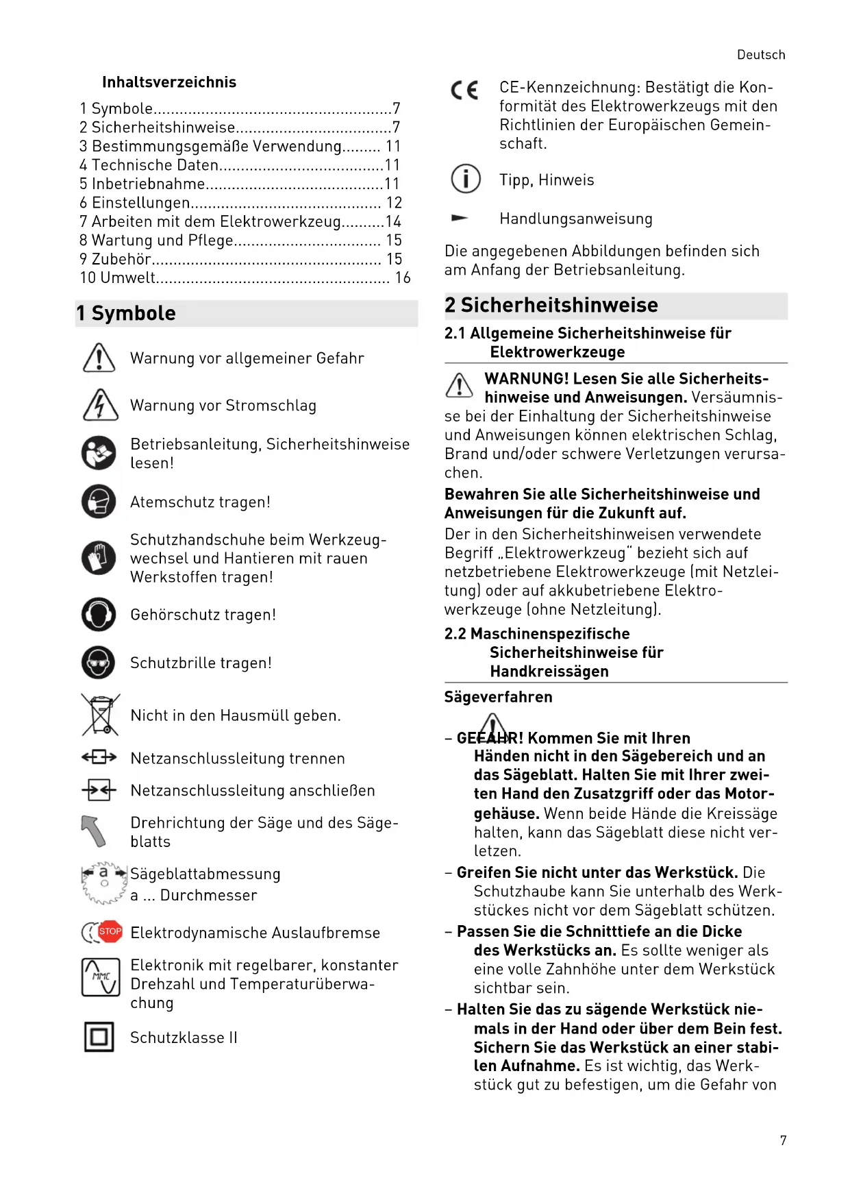 - 10 Umwelt 1 Symbole Warnung vor allgemeiner Gefahr Warnung vor Stromschlag Betriebsanleitung, Sicherheitshinweise lesen! Atemschutz tragen! Schutzhandschuhe beim Werkzeug wechsel und Hantieren mit rauen Werkstoffen tragen! Gehörschutz tragen! Schutzbrille tragen! Nicht in den Hausmüll geben. Netzanschlussleitung trennen Netzanschlussleitung anschließen Drehrichtung der Säge und des Säge blatts Sägeblattabmessung a Durchmesser STOP Elektrodynamische Auslaufbremse Elektronik mit regelbarer, konstanter Drehzahl und Temperaturüberwa chung Schutzklasse II CE-Kennzeichnung: Bestätigt die Kon formität des Elektrowerkzeugs mit den Richtlinien der Europäischen Gemein schaft. Tipp, Hinweis Handlungsanweisung Die angegebenen Abbildungen befinden sich am Anfang der Betriebsanleitung. 2 Sicherheitshinweise p. 16