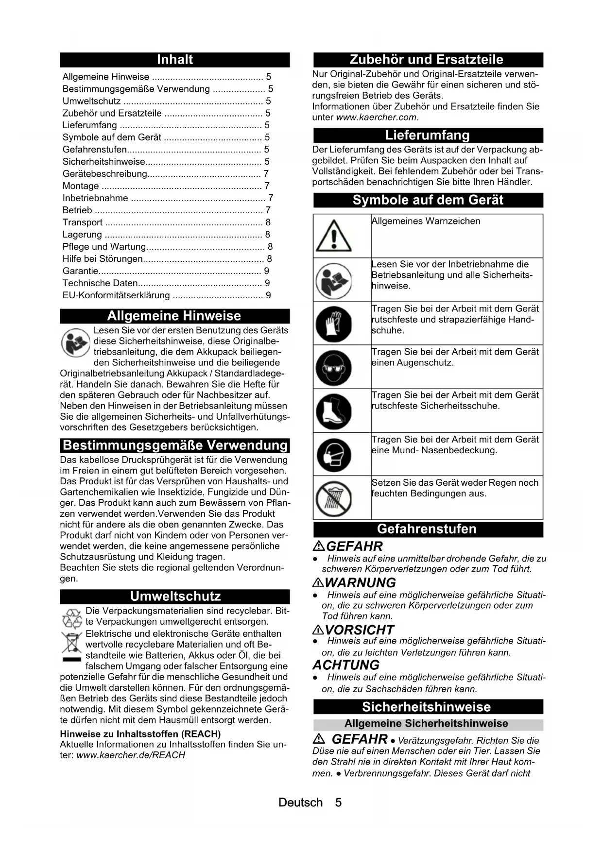 - 143AB C D E F G H IJ KDeutsch 5 Inhalt Allgemeine Hinweise Lesen Sie vor der ersten Benutzung des Geräts diese Sicherheitshinweise, diese Originalbe- triebsanleitung, die dem Akkupack beiliegen- den Sicherheitshinweise und die beiliegende Originalbetriebsanleitung Akkupack / Standardladege- rät. Handeln Sie danach. Bewahren Sie die Hefte für den späteren Gebrauch oder für Nachbesitzer auf. Neben den Hinweisen in der Betriebsanleitung müssen Sie die allgemeinen Sicherheits- und Unfallverhütungs- vorschriften des Gesetzgebers berücksichtigen. Bestimmungsgemäße Verwendung Das kabellose Drucksprühgerät ist für die Verwendung im Freien in einem gut belüfteten Bereich vorgesehen. Das Produkt ist für das Versprühen von Haushalts- und Gartenchemikalien wie Insektizide, Fungizide und Dün- ger. Das Produkt kann auch zum Bewässern von Pflan- zen verwendet werden.Verwenden Sie das Produkt nicht für andere als die oben genannten Zwecke. Das Produkt darf nicht von Kindern oder von Personen ver- wendet werden, die keine angemessene persönliche Schutzausrüstung und Kleidung tragen. Beachten Sie stets die regional geltenden Verordnun- gen. Umweltschutz Die Verpackungsmaterialien sind recyclebar. Bit- te Verpackungen umweltgerecht entsorgen. Elektrische und elektronische Geräte enthalten wertvolle recyclebare Materialien und oft Be- standteile wie Batterien, Akkus oder Öl, die bei falschem Umgang oder falscher Entsorgung eine potenzielle Gefahr für die menschliche Gesundheit und die Umwelt darstellen können. Für den ordnungsgemä- ßen Betrieb des Geräts sind diese Bestandteile jedoch notwendig. Mit diesem Symbol gekennzeichnete Gerä- te dürfen nicht mit dem Hausmüll entsorgt werden. Hinweise zu Inhaltsstoffen (REACH) Aktuelle Informationen zu Inhaltsstoffen finden Sie un- ter: www.kaercher.de/REACH Zubehör und Ersatzteile Nur Original-Zubehör und Original-Ersatzteile verwen- den, sie bieten die Gewähr für einen sicheren und stö- rungsfreien Betrieb des Geräts. Informationen über Zubehör und Ersatzteile finden Sie unter www.kaercher.com. Lieferumfang Der Lieferumfang des Geräts ist auf der Verpackung ab- gebildet. Prüfen Sie beim Auspacken den Inhalt auf Vollständigkeit. Bei fehlendem Zubehör oder bei Trans- portschäden benachrichtigen Sie bitte Ihren Händler. Symbole auf dem Gerät Gefahrenstufen GEFAHR ● Hinweis auf eine unmittelbar drohende Gefahr, die zu schweren Körperverletzungen oder zum Tod führt. 몇 WARNUNG ● Hinweis auf eine möglicherweise gefährliche Situati- on, die zu schweren Körperverletzungen oder zum Tod führen kann. 몇 VORSICHT ● Hinweis auf eine möglicherweise gefährliche Situati- on, die zu leichten Verletzungen führen kann. ACHTUNG ● Hinweis auf eine möglicherweise gefährliche Situati- on, die zu Sachschäden führen kann. Sicherheitshinweise Allgemeine Sicherheitshinweise GEFAHR ● Verätzungsgefahr. Richten Sie die Düse nie auf einen Menschen oder ein Tier. Lassen Sie den Strahl nie in direkten Kontakt mit Ihrer Haut kom- men. ● Verbrennungsgefahr. Dieses Gerät darf nicht Allgemeine Hinweise p. 5