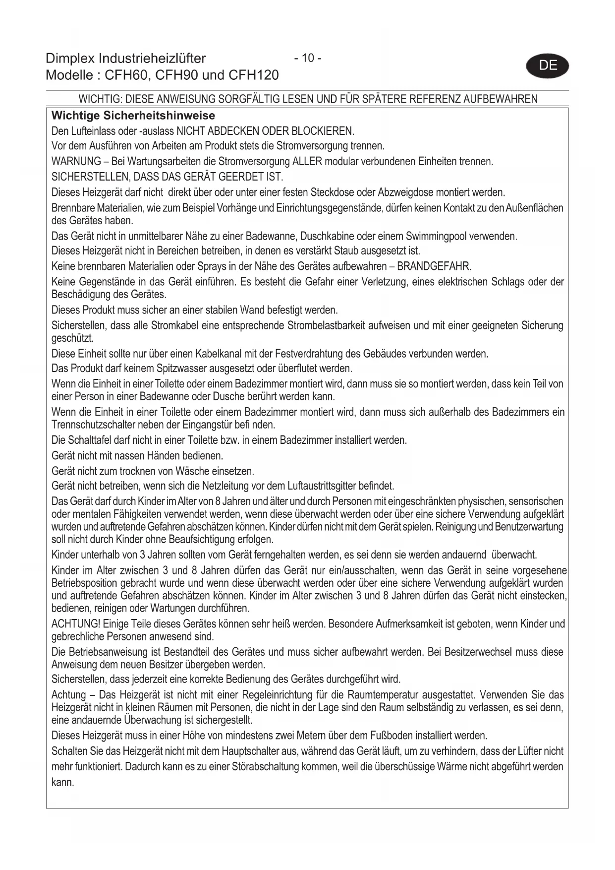 Finden Sie kostenlos die Bedienungsanleitung des Geräts CFH120 DIMPLEX als PDF.