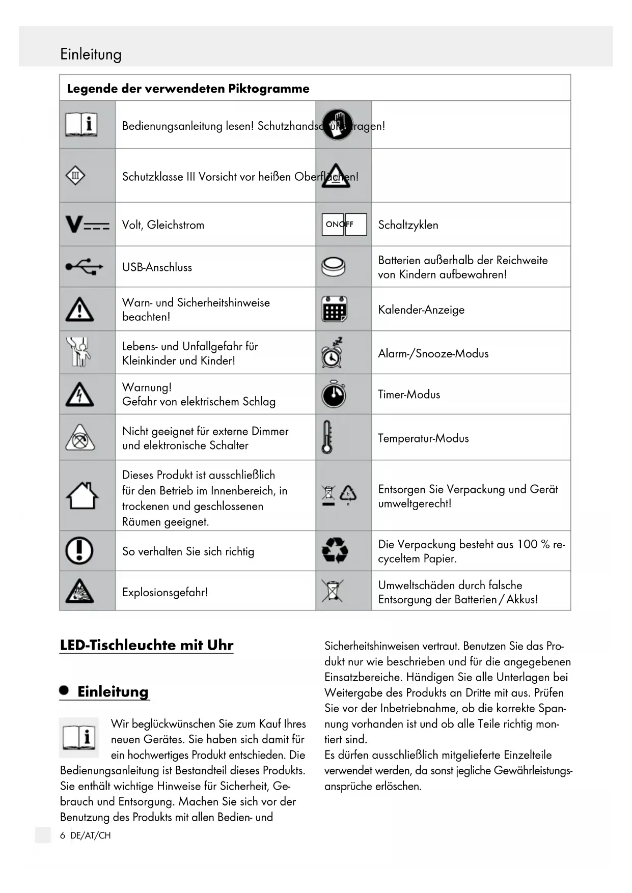 Entsorgen Sie Verpackung und Gerät umweltgerecht! So verhalten Sie sich richtig Die Verpackung besteht aus 100 % re- cyceltem Papier. Explosionsgefahr! Umweltschäden durch falsche Entsorgung der Batterien / Akkus! LED-Tischleuchte mit Uhr Einleitung Wir beglückwünschen Sie zum Kauf Ihres neuen Gerätes. Sie haben sich damit für ein hochwertiges Produkt entschieden. Die Bedienungsanleitung ist Bestandteil dieses Produkts. Sie enthält wichtige Hinweise für Sicherheit, Ge- brauch und Entsorgung. Machen Sie sich vor der Benutzung des Produkts mit allen Bedien- und Sicherheitshinweisen vertraut. Benutzen Sie das Pro- dukt nur wie beschrieben und für die angegebenen Einsatzbereiche. Händigen Sie alle Unterlagen bei Weitergabe des Produkts an Dritte mit aus. Prüfen Sie vor der Inbetriebnahme, ob die korrekte Span- nung vorhanden ist und ob alle Teile richtig mon- tiert sind. Es dürfen ausschließlich mitgelieferte Einzelteile verwendet werden, da sonst jegliche Gewährleistungs- ansprüche erlöschen. Einleitung / Sicherheit7 DE/AT/CH Einleitung Einleitung / Sicherheit Bestimmungsgemäße Verwendung Dieses Produkt ist ausschließlich für den Betrieb im Innenbereich, in trockenen und geschlossenen Räumen geeignet. Dieses Gerät ist nur für den Einsatz in privaten Haushalten vorgesehen. Dieser Artikel ist nicht ge- eignet als Raumbeleuchtung oder als Nachtlicht. Lieferumfang Kontrollieren Sie unmittelbar nach dem Auspacken immer den Lieferumfang auf Vollständigkeit sowie den einwandfreien Zustand des Gerätes. 1 LED-Tischleuchte mit Uhr 14137006L / 14137005L 1 Micro-USB-Kabel 1 Knopfzelle, Typ CR2032 1 Bedienungsanleitung Teilebeschreibung