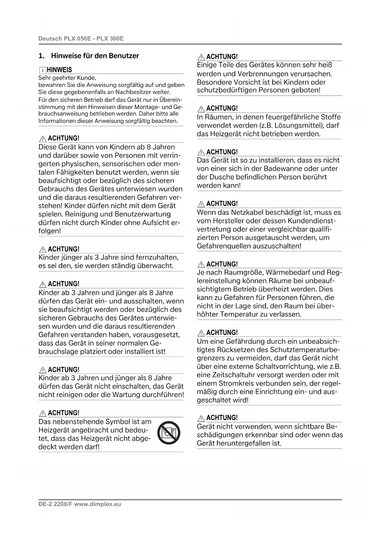 Sehr geehrter Kunde, bewahren Sie die Anweisung sorgfältig auf und geben Sie diese gegebenenfalls an Nachbesitzer weiter. Für den sicheren Betrieb darf das Gerät nur in Überein- stimmung mit den Hinweisen dieser Montage- und Ge- brauchsanweisung betrieben werden. Daher bitte alle Informationen dieser Anweisung sorgfältig beachten. ACHTUNG! Diese Gerät kann von Kindern ab 8 Jahren und darüber sowie von Personen mit verrin- gerten physischen, sensorischen oder men- talen Fähigkeiten benutzt werden, wenn sie beaufsichtigt oder bezüglich des sicheren Gebrauchs des Gerätes unterwiesen wurden und die daraus resultierenden Gefahren ver- stehen! Kinder dürfen nicht mit dem Gerät spielen. Reinigung und Benutzerwartung dürfen nicht durch Kinder ohne Aufsicht er- folgen! ACHTUNG! Kinder jünger als 3 Jahre sind fernzuhalten, es sei den, sie werden ständig überwacht. ACHTUNG! Kinder ab 3 Jahren und jünger als 8 Jahre dürfen das Gerät ein- und ausschalten, wenn sie beaufsichtigt werden oder bezüglich des sicheren Gebrauchs des Gerätes unterwie- sen wurden und die daraus resultierenden Gefahren verstanden haben, vorausgesetzt, dass das Gerät in seiner normalen Ge- brauchslage platziert oder installiert ist! ACHTUNG! Kinder ab 3 Jahren und jünger als 8 Jahre dürfen das Gerät nicht einschalten, das Gerät nicht reinigen oder die Wartung durchführen! ACHTUNG! Das nebenstehende Symbol ist am Heizgerät angebracht und bedeu- tet, dass das Heizgerät nicht abge- deckt werden darf! ACHTUNG! Einige Teile des Gerätes können sehr heiß werden und Verbrennungen verursachen. Besondere Vorsicht ist bei Kindern oder schutzbedürftigen Personen geboten! ACHTUNG! In Räumen, in denen feuergefährliche Stoffe verwendet werden (z.B. Lösungsmittel), darf das Heizgerät nicht betrieben werden. ACHTUNG! Das Gerät ist so zu installieren, dass es nicht von einer sich in der Badewanne oder unter der Dusche befindlichen Person berührt werden kann! ACHTUNG! Wenn das Netzkabel beschädigt ist, muss es vom Hersteller oder dessen Kundendienst- vertretung oder einer vergleichbar qualifi- zierten Person ausgetauscht werden, um Gefahrenquellen auszuschalten! ACHTUNG! Je nach Raumgröße, Wärmebedarf und Reg- lereinstellung können Räume bei unbeauf- sichtigtem Betrieb überheizt werden. Dies kann zu Gefahren für Personen führen, die nicht in der Lage sind, den Raum bei über- höhter Temperatur zu verlassen. ACHTUNG! Um eine Gefährdung durch ein unbeabsich- tigtes Rücksetzen des Schutztemperaturbe- grenzers zu vermeiden, darf das Gerät nicht über eine externe Schaltvorrichtung, wie z.B. eine Zeitschaltuhr versorgt werden oder mit einem Stromkreis verbunden sein, der regel- mäßig durch eine Einrichtung ein- und aus- geschaltet wird! ACHTUNG! Gerät nicht verwenden, wenn sichtbare Be- schädigungen erkennbar sind oder wenn das Gerät heruntergefallen ist.www.dimplex.eu 2208/F DE-3 PLX 050E - PLX 300E Deutsch ACHTUNG! Wenn sich das Gerät unbeobachtet automa- tisch einschaltet, können Gefahren entste- hen, z.B. können Geräte, die zwischenzeitlich abgedeckt oder verstellt wurden, Brände verursachen! HINWEIS