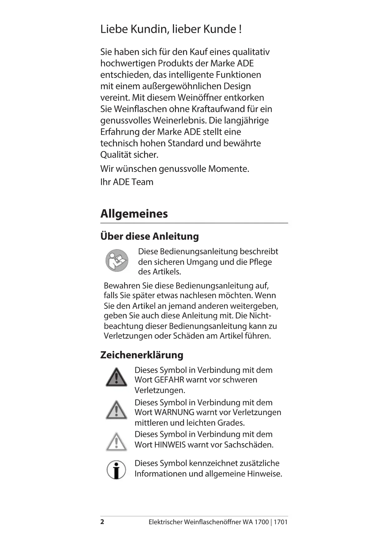 Deutsch Garantie Sehr geehrte Kundin, sehr geehrter Kunde, die Firma Waagen-Schmitt GmbH garantiert für 3Jahre ab Kaufdatum die kostenfreie Behebung von Mängeln aufgrund Material- oder Fabrikati- onsfehlern durch Reparatur oder Austausch. Bitte geben Sie den Artikel im Garantiefall mit dem Kauf- beleg (unter Angabe des Reklamationsgrundes) an Ihren Händler zurück. Entsorgen Entsorgen Sie den Artikel entsprechend der Vorschriften, die in Ihrem Land gelten. Die voll- ständigen Entsorgungshinweise finden Sie in der ausführlichen Bedienungsanleitung. Verpackung entsorgen Entsorgen Sie die Verpackung sortenrein. Geben Sie Pappe und Karton zum Altpapier, Folien in die Wertstoff-Sammlung. Artikel entsorgen Entsorgen Sie den Artikel entsprechend der Vor- schriften, die in Ihrem Land gelten. Geräte dürfen nicht im normalen Hausmüll entsorgt werden Am Ende seiner Lebensdauer ist der Artikel ei- ner geordneten Entsorgung zuzuführen. Dabei werden im Gerät enthaltene Wertstoffe der Wie- derverwertung zugeführt und die Belastung der Umwelt vermieden. Geben Sie das Altgerät an einer Sammelstelle für Elektroschrott oder einem Wertstoffhof ab. Wenden Sie sich für nähere Aus- künfte an Ihr örtliches Entsorgungsunternehmen oder Ihre kommunale Verwaltung. Batterien und Akkus gehören nicht in den Hausmüll Alle Batterien und Akkus müssen bei einer Sam- melstelle der Gemeinde, des Stadtteils oder im Handel abgegeben werden. Dadurch können Batterien und Akkus einer umweltschonenden Entsorgung zugeführt werden. Weinoeffner WA 1700_1701.indb 11 04.05.2017 13:06:5412 Electric Wine Bottle Opener WA 1700 | 1701 Dear Customer! You have chosen to purchase a high- quality product from the brand ADE, which combines intelligent functions with an exceptional design. Uncork wine bottles effortlessly with this wine opener for a delightful wine experience. The many years of experience of the brand ADE ensures a high technical standard and proven quality. We wish you delightful moments. Your ADE Team General information About this manual This operating manual describes how to safely use and care for your products. Keep this operating manual in a safe place in case you would like to refer to it later. If you pass this item on to someone else, pass on this manual as well. Failure to observe the recommendations in this operating manual can lead to injuries or damage to your product. Explanation of symbols This symbol, combined with the word DANGER, warns against serious injury. This symbol, combined with the word WARNING, warns against moderate and mild injuries. This symbol, combined with the word NOTE, warns against material damage. This symbol signifies additional information and general advice. Weinoeffner WA 1700_1701.indb 12 04.05.2017 13:06:54Electric Wine Bottle Opener WA 1700 | 1701