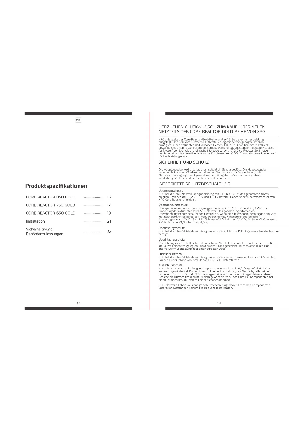 Die Hauptausgabe wird unterbrochen, sobald ein Schutz auslöst. Die Hauptausgabe kann durch Aus- und Wiedereinschalten der Gleichspannungsfernbedienung oder Netzstromversorgung zurückgesetzt werden. Ausgabe +5 Vsb wird automatisch wiederhergestellt, sobald der Fehlerzustand behoben ist. INTEGRIERTE SCHUTZBESCHALTUNG Überstromschutz : XPG hat die Intel-Netzteil-Designanleitung mit 110 bis 140 % des gesamten Stroms an allen Schienen mit +12 V, +5 V und +3,3 V befolgt. Daher ist der Überstromschutz von XPG Core Reactor effektiver. Überspannungsschutz : Überspannungsschutz an den Ausgangsschienen mit +12 V, +5 V und +3,3 V ist zur Einhaltung der aktuellsten Intel-ATX-Netzteil-Designanleitung erforderlich. Überspannungsschutz schaltet das Netzteil ab, wenn die Gleichspannungsausgabe ein vom Netzteilhersteller festgelegtes Niveau überschreitet. Mindestens erforderliche Spannungsniveaus für Konformität: Schiene +12 V bei max. 15,6 V, Schiene +5 V bei max. 7,0 V, Schiene +3,3 V bei max. 4,5 V. Überlastungsschutz : XPG hat die Intel-ATX-Netzteil-Designanleitung mit 110 bis 150 % gesamte Netzteilleistung befolgt. Überhitzungsschutz : Überhitzungsschutz stellt sicher, dass sich das Netzteil abschaltet, sobald die Temperatur im Netzteil einen festgelegten Punkt erreicht. Dies geschieht üblicherweise durch eine interne Stromüberlastung oder einen defekten Lüfter. Lastfreier Betrieb : XPG hat die Intel-ATX-Netzteil-Designanleitung mit einer minimalen Last von 0 A befolgt, um den Ruhezustand von Intel Haswell C6/C7 zu unterstützen. Kurzschlussschutz : Kurzschlussschutz ist als Ausgangsimpedanz von weniger als 0,1 Ohm definiert. Unter anderem gewährleistet Kurzschlussschutz eine Abschaltung des Netzteils, falls bei den Schienen +12 V, +5 V und +3,3 V aus irgendeinem Grund oder mit irgendeiner anderen Schiene ein Kurzschluss auftritt. Zudem gewährleistet er, dass Ihre PC-Komponenten bei einem Kurzschluss im System keinen Schaden nehmen. XPG-Netzteile haben vollständige Schutzbeschaltung, damit Ihre teuren Komponenten unter allen Umständen keinem Risiko ausgesetzt werden. 1413ATX-Kabel, 24-polig (20+4) EPS/ATX12V-Kabel, 8-polig (4+4) PCI-E-Kabel, 8-polig (6+2) PCI-E-Kabel, 8-polig (6+2) SATA-Kabel (4 SATA) Peripheriekabel, 4-polig Beschreibung Gesamtlänge 650mm (± 10mm) 650mm (± 10mm) 650mm (± 10mm) 650mm (± 10mm) 500mm (± 10mm) 500mm (± 10mm)