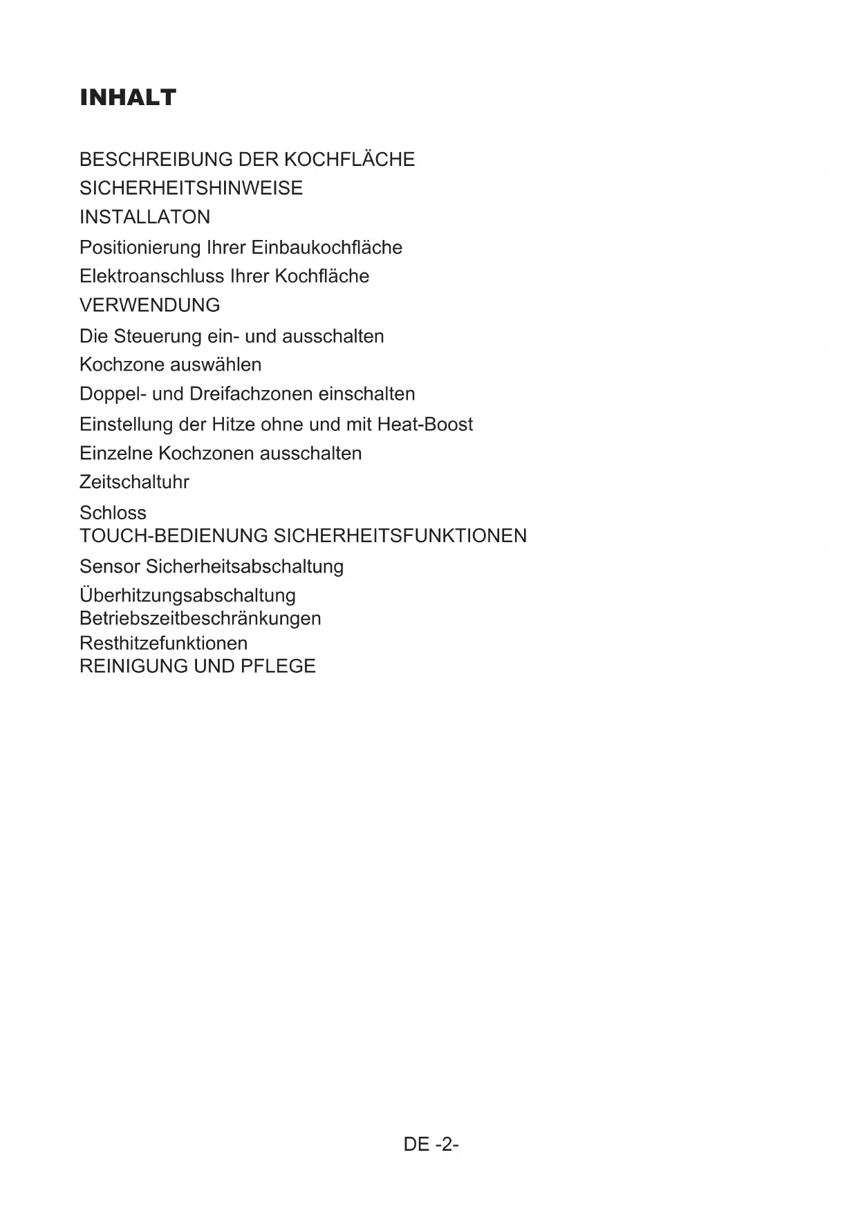 SICHERHEITSHINWEISE INSTALLATON Positionierung Ihrer Einbaukochäche Elektroanschluss Ihrer Kochäche VERWENDUNG Die Steuerung ein- und ausschalten Kochzone auswählen Doppel- und Dreifachzonen einschalten Einstellung der Hitze ohne und mit Heat-Boost Einzelne Kochzonen ausschalten Zeitschaltuhr Schloss TOUCH-BEDIENUNG SICHERHEITSFUNKTIONEN Sensor Sicherheitsabschaltung Überhitzungsabschaltung Betriebszeitbeschränkungen Resthitzefunktionen