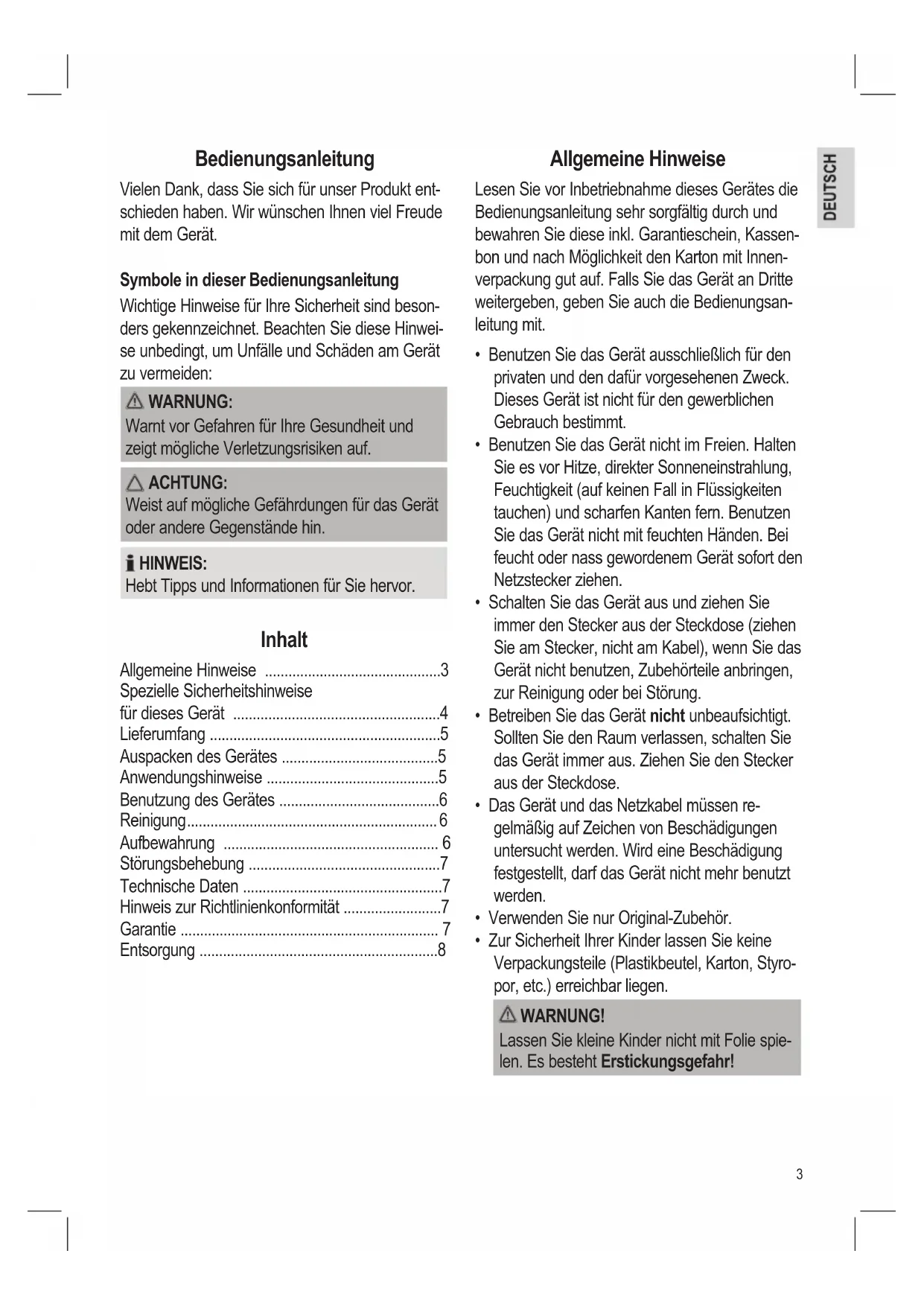 - Bedienungsanleitung Vielen Dank, dass Sie sich für unser Produkt ent- schieden haben. Wir wünschen Ihnen viel Freude mit dem Gerät. Symbole in dieser Bedienungsanleitung Wichtige Hinweise für Ihre Sicherheit sind beson- ders gekennzeichnet. Beachten Sie diese Hinwei- se unbedingt, um Unfälle und Schäden am Gerät zu vermeiden: WARNUNG: Warnt vor Gefahren für Ihre Gesundheit und zeigt mögliche Verletzungsrisiken auf. ACHTUNG: Weist auf mögliche Gefährdungen für das Gerät oder andere Gegenstände hin. HINWEIS: Hebt Tipps und Informationen für Sie hervor. Inhalt Allgemeine Hinweise p. 3