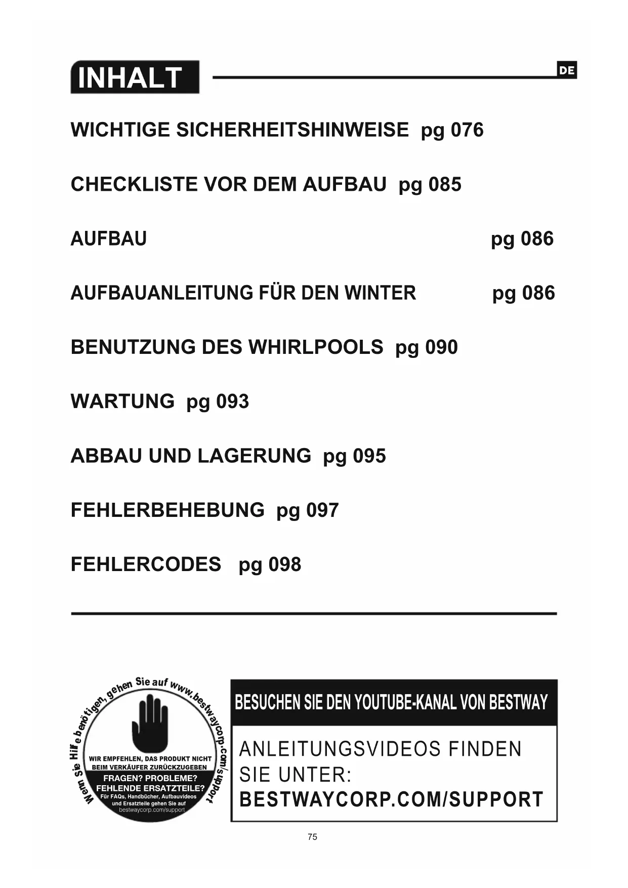 WIR EMPFEHLEN, DAS PRODUKT NICHTBEIM VERKÄUFER ZURÜCKZUGEBENFRAGEN? PROBLEME?FEHLENDE ERSATZTEILE?Für FAQs, Handbücher, Aufbauvideos und Ersatzteile gehen Sie auf bestwaycorp.com/support WICHTIGE SICHERHEITSHINWEISE pg 076CHECKLISTE VOR DEM AUFBAU pg 085AUFBAU pg 086AUFBAUANLEITUNG FÜR DEN WINTER pg 086BENUTZUNG DES WHIRLPOOLS pg 090WARTUNG pg 093ABBAU UND LAGERUNG pg 095FEHLERBEHEBUNG pg 097FEHLERCODES pg 098SICHERHEITSANWEISUNGEN Lesen, verstehen und beachten Sie sämtliche Hinweise in dieser Bedienungsanleitung, bevor Sie den Whirlpool aufstellen und verwenden.