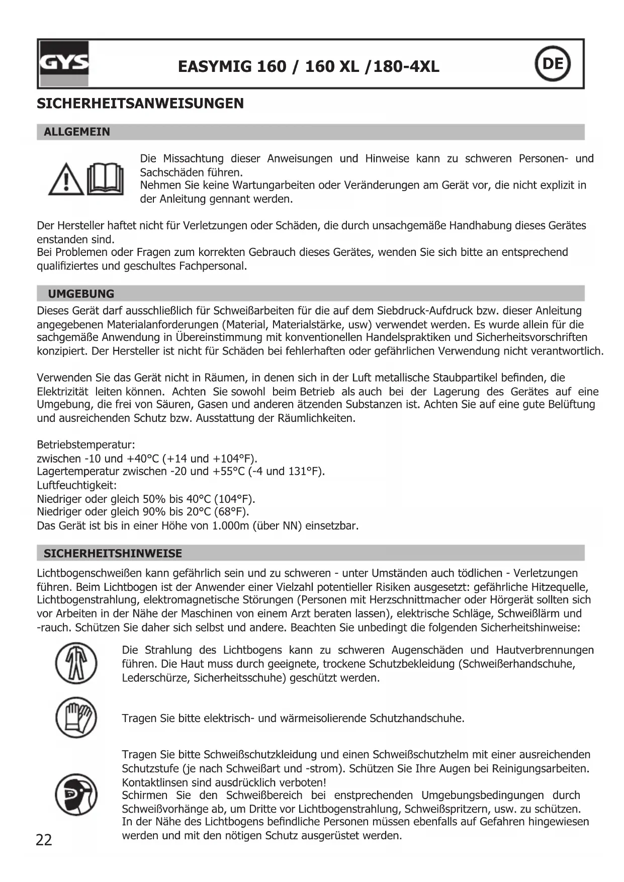 SICHERHEITSANWEISUNGEN ALLGEMEIN Die Missachtung dieser Anweisungen und Hinweise kann zu schweren Personen- und Sachschäden führen. Nehmen Sie keine Wartungarbeiten oder Veränderungen am Gerät vor, die nicht explizit in der Anleitung gennant werden. Der Hersteller haftet nicht für Verletzungen oder Schäden, die durch unsachgemäße Handhabung dieses Gerätes enstanden sind. Bei Problemen oder Fragen zum korrekten Gebrauch dieses Gerätes, wenden Sie sich bitte an entsprechend qualiziertes und geschultes Fachpersonal. UMGEBUNG Dieses Gerät darf ausschließlich für Schweißarbeiten für die auf dem Siebdruck-Aufdruck bzw. dieser Anleitung angegebenen Materialanforderungen (Material, Materialstärke, usw) verwendet werden. Es wurde allein für die sachgemäße Anwendung in Übereinstimmung mit konventionellen Handelspraktiken und Sicherheitsvorschriften konzipiert. Der Hersteller ist nicht für Schäden bei fehlerhaften oder gefährlichen Verwendung nicht verantwortlich. Verwenden Sie das Gerät nicht in Räumen, in denen sich in der Luft metallische Staubpartikel benden, die Elektrizität leiten können. Achten Sie sowohl beim Betrieb als auch bei der Lagerung des Gerätes auf eine Umgebung, die frei von Säuren, Gasen und anderen ätzenden Substanzen ist. Achten Sie auf eine gute Belüftung und ausreichenden Schutz bzw. Ausstattung der Räumlichkeiten. Betriebstemperatur: zwischen -10 und +40°C (+14 und +104°F). Lagertemperatur zwischen -20 und +55°C (-4 und 131°F). Luftfeuchtigkeit: Niedriger oder gleich 50% bis 40°C (104°F). Niedriger oder gleich 90% bis 20°C (68°F). Das Gerät ist bis in einer Höhe von 1.000m (über NN) einsetzbar. SICHERHEITSHINWEISE Lichtbogenschweißen kann gefährlich sein und zu schweren - unter Umständen auch tödlichen - Verletzungen führen. Beim Lichtbogen ist der Anwender einer Vielzahl potentieller Risiken ausgesetzt: gefährliche Hitzequelle, Lichtbogenstrahlung, elektromagnetische Störungen (Personen mit Herzschnittmacher oder Hörgerät sollten sich vor Arbeiten in der Nähe der Maschinen von einem Arzt beraten lassen), elektrische Schläge, Schweißlärm und -rauch. Schützen Sie daher sich selbst und andere. Beachten Sie unbedingt die folgenden Sicherheitshinweise: Die Strahlung des Lichtbogens kann zu schweren Augenschäden und Hautverbrennungen führen. Die Haut muss durch geeignete, trockene Schutzbekleidung (Schweißerhandschuhe, Lederschürze, Sicherheitsschuhe) geschützt werden. Tragen Sie bitte elektrisch- und wärmeisolierende Schutzhandschuhe. Tragen Sie bitte Schweißschutzkleidung und einen Schweißschutzhelm mit einer ausreichenden Schutzstufe (je nach Schweißart und -strom). Schützen Sie Ihre Augen bei Reinigungsarbeiten. Kontaktlinsen sind ausdrücklich verboten! Schirmen Sie den Schweißbereich bei enstprechenden Umgebungsbedingungen durch Schweißvorhänge ab, um Dritte vor Lichtbogenstrahlung, Schweißspritzern, usw. zu schützen. In der Nähe des Lichtbogens bendliche Personen müssen ebenfalls auf Gefahren hingewiesen werden und mit den nötigen Schutz ausgerüstet werden.EASYMIG 160 / 160 XL /180-4XL