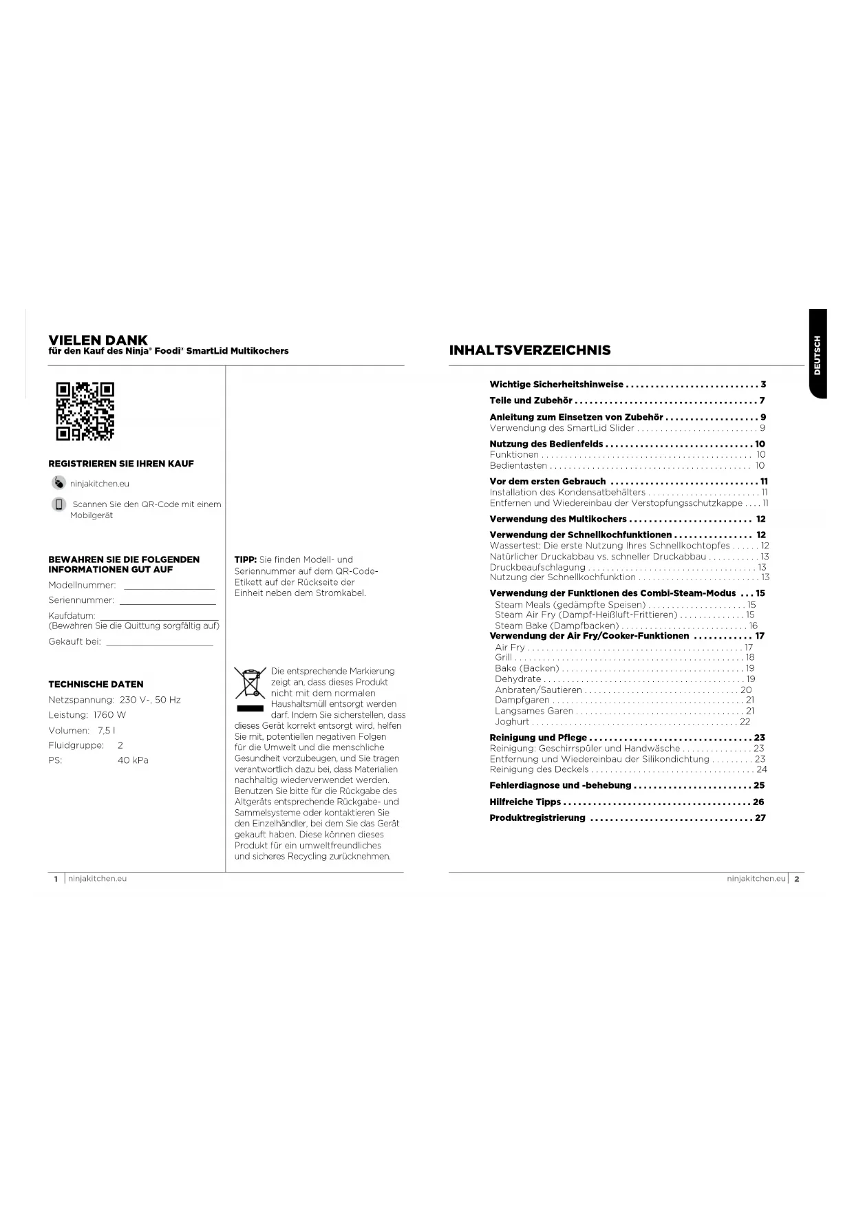 - Stellen Sie den Schieberegler auf die Position PRESSURE, um den Deckel zu schließen. 1 Um eine gleichmäßige Bräunung zu erreichen, achten Sie darauf, dass die Zutaten gleichmäßig auf dem Boden des Kochtopfs verteilt sind und diese sich nicht überlappen. Falls die Zutaten übereinander liegen, müssen diese nach der Hälfte der gewählten Garzeit geschüttelt werden. 2 Wir empfehlen kleinere Zutaten, die durch den Wenderost fallen könnten, in Pergamentpapier oder Folienbeutel einzuwickeln. 3 Verwenden Sie den Warmhaltemodus KEEP WARM, um die Speisen nach dem Garen auf einer warmen, für Lebensmittel sicheren Temperatur zu halten. Damit die Speisen nicht austrocknen, empfehlen wir, den Deckel geschlossen zu halten und diese Funktion kurz vor dem Servieren zu verwenden. 4 Verwenden Sie zum Aufwärmen von Speisen die Funktion AIR FRY. HILFREICHE TIPPS FEHLERBEHEBUNG – FORTSETZUNG DEUTSCH27 28 ninjakitchen.eu ninjakitchen.eu Welche Vorteile habe ich von der Registrierung meiner Garantie? Wenn Sie Ihre Garantie registrieren, können Sie auch unseren Newsletter mit Tipps, Ratschlägen und Gewinnspielen abonnieren. Über den Newsletter erhalten Sie aktuelle Nachrichten zu neuen Technologien und Produkten von Ninja. Wenn Sie Ihre Garantie online registrieren, erhalten Sie sofort eine Bestätigung, dass Ihre Daten bei uns eingegangen sind. Details zu unserer Datenschutzrichtlinie finden Sie unter www.ninjakitchen.eu. Wie lang ist die Garantie auf unsere Produkte? Da wir großes Vertrauen in unser Design und die Qualitätskontrolle setzen, ist Ihre Garantie für Ihr Produkt zwei (2) Jahre lang gültig. Was wird durch die Garantie abgedeckt? Reparatur oder Ersatz Ihres Produkts (nach Wahl von Ninja), einschließlich aller Teile und der Arbeitszeit bei Konstruktions-, Material- und Verarbeitungsfehlern (inklusive Transport- und Versandkosten). Unsere Garantie erhalten Sie zusätzlich zu Ihren Rechten als Verbraucher. Was wird durch die Garantien nicht abgedeckt?