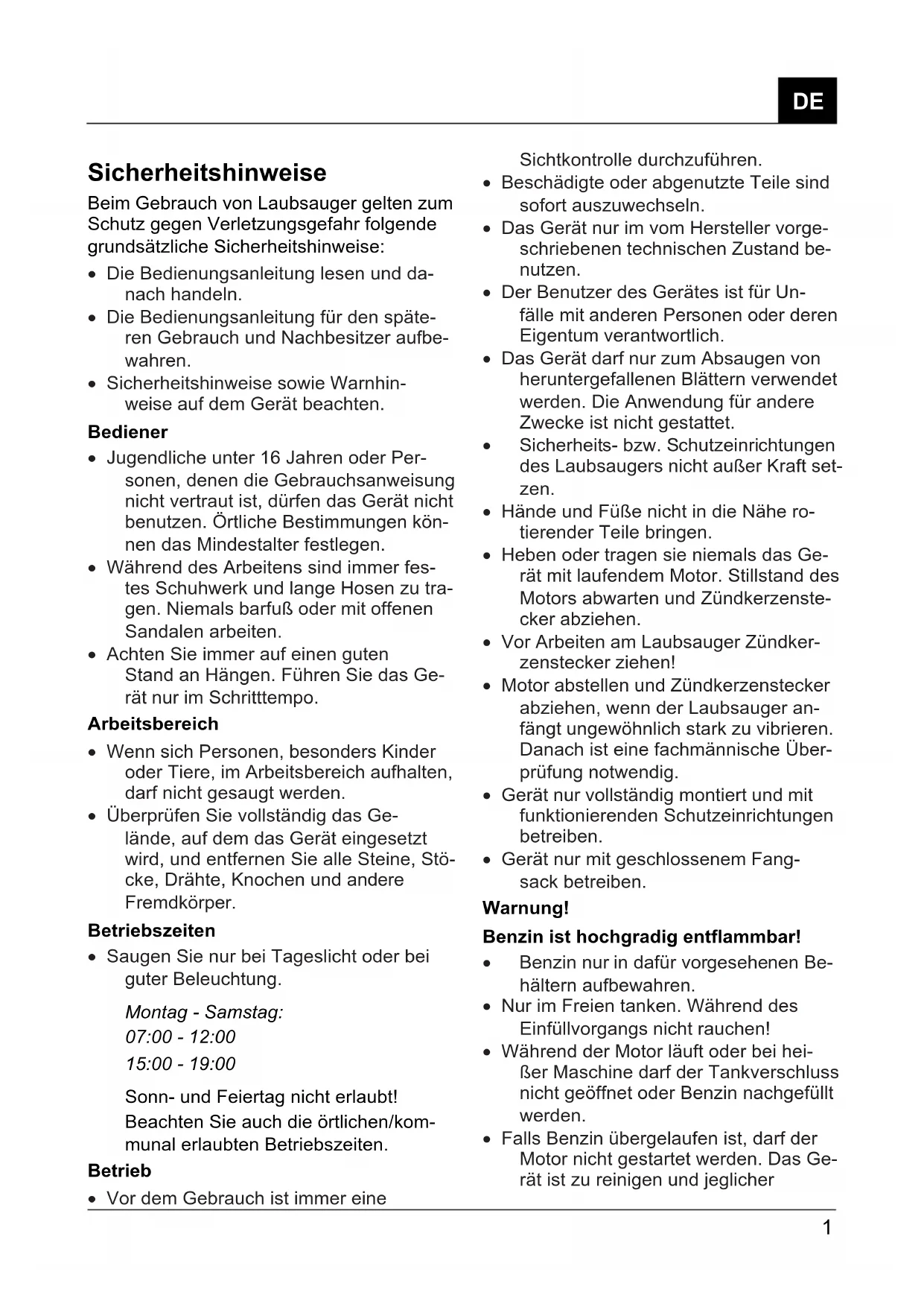 Sicherheitshinweise Beim Gebrauch von Laubsauger gelten zum Schutz gegen Verletzungsgefahr folgende grundsätzliche Sicherheitshinweise: