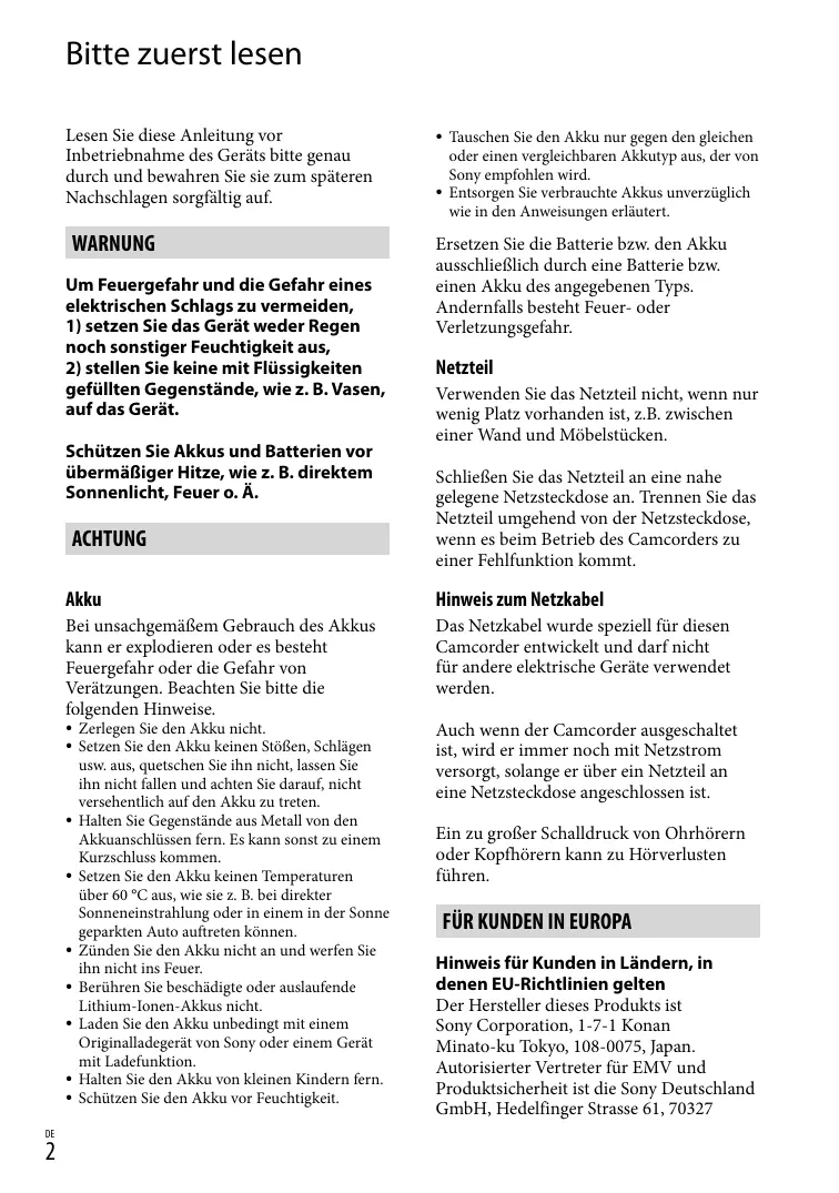 Zerlegen Sie den Akku nicht. Setzen Sie den Akku keinen Stößen, Schlägen usw. aus, quetschen Sie ihn nicht, lassen Sie ihn nicht fallen und achten Sie darauf, nicht versehentlich auf den Akku zu treten. Halten Sie Gegenstände aus Metall von den Akkuanschlüssen fern. Es kann sonst zu einem Kurzschluss kommen. Setzen Sie den Akku keinen Temperaturen über 60 °C aus, wie sie z. B. bei direkter Sonneneinstrahlung oder in einem in der Sonne geparkten Auto auftreten können. Zünden Sie den Akku nicht an und werfen Sie ihn nicht ins Feuer. Berühren Sie beschädigte oder auslaufende Lithium-Ionen-Akkus nicht. Laden Sie den Akku unbedingt mit einem Originalladegerät von Sony oder einem Gerät mit Ladefunktion. Halten Sie den Akku von kleinen Kindern fern. Schützen Sie den Akku vor Feuchtigkeit. Auch wenn der Camcorder ausgeschaltet ist, wird er immer noch mit Netzstrom versorgt, solange er über ein Netzteil an eine Netzsteckdose angeschlossen ist. Ein zu großer Schalldruck von Ohrhörern oder Kopfhörern kann zu Hörverlusten führen.
