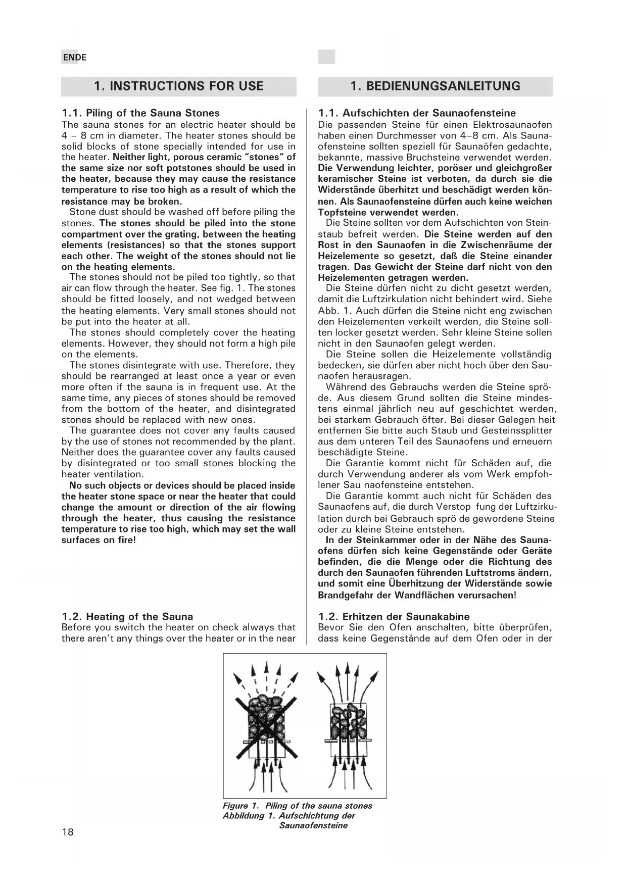 1.1. Aufschichten der Saunaofensteine Die passenden Steine für einen Elektrosaunaofen haben einen Durchmesser von 4–8 cm. Als Sauna- ofensteine sollten speziell für Saunaöfen gedachte, bekannte, massive Bruchsteine verwendet werden. Die Verwendung leichter, poröser und gleichgroßer keramischer Steine ist verboten, da durch sie die Widerstände überhitzt und beschädigt werden kön- nen. Als Saunaofensteine dürfen auch keine weichen Topfsteine verwendet werden. Die Steine sollten vor dem Aufschichten von Stein- staub befreit werden. Die Steine werden auf den Rost in den Saunaofen in die Zwischenräume der Heizelemente so gesetzt, daß die Steine einander tragen. Das Gewicht der Steine darf nicht von den Heizelementen getragen werden. Die Steine dürfen nicht zu dicht gesetzt werden, damit die Luftzirkulation nicht behindert wird. Siehe Abb. 1. Auch dürfen die Steine nicht eng zwischen den Heizelementen verkeilt werden, die Steine soll- ten locker gesetzt werden. Sehr kleine Steine sollen nicht in den Saunaofen gelegt werden. Die Steine sollen die Heizelemente vollständig bedecken, sie dürfen aber nicht hoch über den Sau- naofen herausragen. Während des Gebrauchs werden die Steine sprö- de. Aus diesem Grund sollten die Steine mindes- tens einmal jährlich neu auf geschichtet werden, bei starkem Gebrauch öfter. Bei dieser Gelegen heit entfernen Sie bitte auch Staub und Gesteinssplitter aus dem unteren Teil des Saunaofens und erneuern beschädigte Steine. Die Garantie kommt nicht für Schäden auf, die durch Verwendung anderer als vom Werk empfoh- lener Sau naofensteine entstehen. Die Garantie kommt auch nicht für Schäden des Saunaofens auf, die durch Verstop fung der Luftzirku- lation durch bei Gebrauch sprö de gewordene Steine oder zu kleine Steine entstehen. In der Steinkammer oder in der Nähe des Sauna- ofens dürfen sich keine Gegenstände oder Geräte befinden, die die Menge oder die Richtung des durch den Saunaofen führenden Luftstroms ändern, und somit eine Überhitzung der Widerstände sowie Brandgefahr der Wandflächen verursachen! 1.2. Erhitzen der Saunakabine Bevor Sie den Ofen anschalten, bitte überprüfen, dass keine Gegenstände auf dem Ofen oder in derEN DE