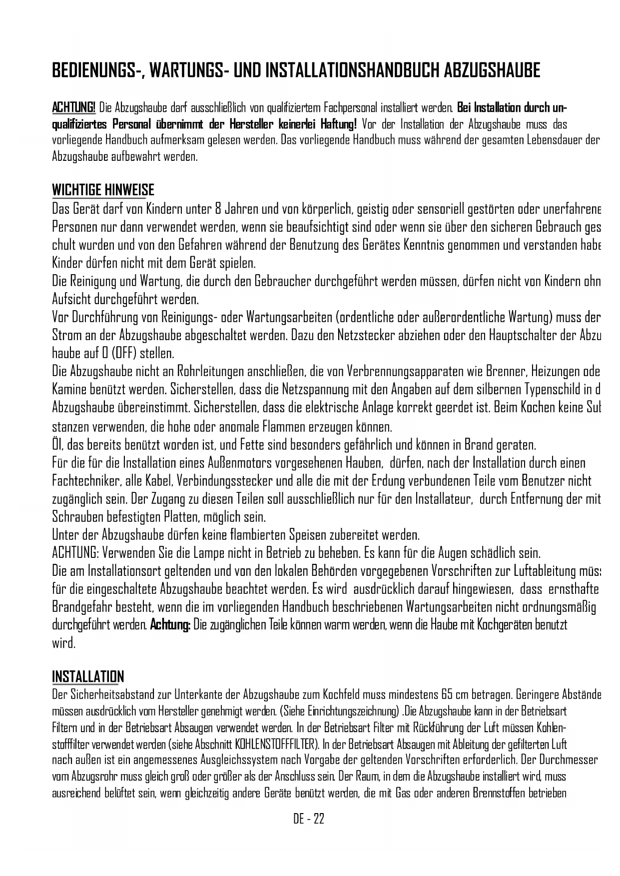 ACHTUNG! Die Abzugshaube darf ausschließlich von qualifiziertem Fachpersonal installiert werden. Bei Installation durch un- qualifiziertes Personal übernimmt der Hersteller keinerlei Haftung! Vor der Installation der Abzugshaube muss das vorliegende Handbuch aufmerksam gelesen werden. Das vorliegende Handbuch muss während der gesamten Lebensdauer der Abzugshaube aufbewahrt werden. WICHTIGE HINWEISE Das Gerät darf von Kindern unter 8 Jahren und von körperlich, geistig oder sensoriell gestörten oder unerfahrenen Personen nur dann verwendet werden, wenn sie beaufsichtigt sind oder wenn sie über den sicheren Gebrauch ges- chult wurden und von den Gefahren während der Benutzung des Gerätes Kenntnis genommen und verstanden haben. Kinder dürfen nicht mit dem Gerät spielen. Die Reinigung und Wartung, die durch den Gebraucher durchgeführt werden müssen, dürfen nicht von Kindern ohne Aufsicht durchgeführt werden. Vor Durchführung von Reinigungs- oder Wartungsarbeiten (ordentliche oder außerordentliche Wartung) muss der Strom an der Abzugshaube abgeschaltet werden. Dazu den Netzstecker abziehen oder den Hauptschalter der Abzugs- haube auf 0 (OFF) stellen. Die Abzugshaube nicht an Rohrleitungen anschließen, die von Verbrennungsapparaten wie Brenner, Heizungen oder Kamine benützt werden. Sicherstellen, dass die Netzspannung mit den Angaben auf dem silbernen Typenschild in der Abzugshaube übereinstimmt. Sicherstellen, dass die elektrische Anlage korrekt geerdet ist. Beim Kochen keine Sub- stanzen verwenden, die hohe oder anomale Flammen erzeugen können. Öl, das bereits benützt worden ist, und Fette sind besonders gefährlich und können in Brand geraten. Für die für die Installation eines Außenmotors vorgesehenen Hauben, dürfen, nach der Installation durch einen Fachtechniker, alle Kabel, Verbindungsstecker und alle die mit der Erdung verbundenen Teile vom Benutzer nicht zugänglich sein. Der Zugang zu diesen Teilen soll ausschließlich nur für den Installateur, durch Entfernung der mit Schrauben befestigten Platten, möglich sein. Unter der Abzugshaube dürfen keine flambierten Speisen zubereitet werden. ACHTUNG: Verwenden Sie die Lampe nicht in Betrieb zu beheben. Es kann für die Augen schädlich sein. Die am Installationsort geltenden und von den lokalen Behörden vorgegebenen Vorschriften zur Luftableitung müssen für die eingeschaltete Abzugshaube beachtet werden. Es wird ausdrücklich darauf hingewiesen, dass ernsthafte Brandgefahr besteht, wenn die im vorliegenden Handbuch beschriebenen Wartungsarbeiten nicht ordnungsmäßig durchgeführt werden. Achtung: Die zugänglichen Teile können warm werden, wenn die Haube mit Kochgeräten benutzt wird. INSTALLATION Der Sicherheitsabstand zur Unterkante der Abzugshaube zum Kochfeld muss mindestens 65 cm betragen. Geringere Abstände müssen ausdrücklich vom Hersteller genehmigt werden. (Siehe Einrichtungszeichnung) .Die Abzugshaube kann in der Betriebsart Filtern und in der Betriebsart Absaugen verwendet werden. In der Betriebsart Filter mit Rückführung der Luft müssen Kohlen- stofffilter verwendet werden (siehe Abschnitt KOHLENSTOFFFILTER). In der Betriebsart Absaugen mit Ableitung der gefilterten Luft nach außen ist ein angemessenes Ausgleichssystem nach Vorgabe der geltenden Vorschriften erforderlich. Der Durchmesser vom Abzugsrohr muss gleich groß oder größer als der Anschluss sein. Der Raum, in dem die Abzugshaube installiert wird, muss ausreichend belüftet sein, wenn gleichzeitig andere Geräte benützt werden, die mit Gas oder anderen Brennstoffen betriebenDE - 23 werden. Hauben für Außenmotore. Die für Außenmotore vorbereiteten Hauben sind mit einem Verbindungsstecker für den Kabelanschluss am Außenmotor ausges- tattet. Dieser Verbindungsstecker befindet sich innerhalb der Haube. Das Kabel für den Außenmotor durch die dafür bestimmte Öffnung an der Haube (üblicherweise in der Nähe der Rauchablassöffnung) ziehen und die beiden Stecker miteinander verbinden. Für diesen Vorgang verweisen wir auf die entsprechende Zeichnung in der Gebrauchsanweisung der Außenmotore. Die Hauben ohne Motor (Art.*0***) müssen ausschließlich mit der vom Hersteller gelieferten und angegebenen Ansaugeinheit mit einer maximalen Leistung von 690 W installiert und angeschlossen werden. Für die für die Installation eines Außenmotors vorgesehenen Hauben, dürfen, nach der Installation durch einen Fachtechniker, alle Kabel, Verbindungsstecker und alle die mit der Erdung verbundenen Teile vom Benutzer nicht zugänglich sein. Der Zugang zu diesen Teilen soll ausschließlich nur für den Installateur, durch Entfernung der mit Schrauben befestigten Platten, möglich sein. MONTAGEANLEITUNG Achtung! Falls die Schrauben und Dϋbel mit dem rodukt mitgeliefert curde, sich vergewissern, daβ sie fϋr die Art der Wand, an der die Abzugshaube befestigt werden soll, geeignet sind. Für die Montage der Abzugshaube das mitgelieferte Zubehör verwenden und wie auf dem beiliegenden Informationsblatt dargestellt vorgehen. STROMANSCHLUSS Der Stromanschluss darf ausschließlich von einem qualifizierten Elektriker durchgeführt werden und muss unter Beachtung der am Installationsort geltenden Vorschriften erfolgen. Sicherstellen, dass die Netzspannung mit den Angaben auf dem silbernen Typenschild in der Abzugshaube überein- stimmt. Sicherstellen, dass die elektrische Anlage unter Beachtung der geltenden Gesetzgebung und mit einer ordnungsmäßigen Erdung ausgeführt worden ist. Das Stromkabel der Abzugshaube muss besonders sorgfältig verlegt werden und darf auf keinen Fall durch Löcher geführt werden, die keine Kabelführung haben. Wird das Gerät direkt an das Stromnetz angeschlossen, muss eine Vorrichtung vorgesehen werden, die eine Trennung vom Strom- netz, mit einem Öffnungsabstand der Kontakte, die eine komplette Abtrennung in den Zuständen der Überspannungskategorie III, entsprechend der Installationsvorschriften, ermöglicht, 